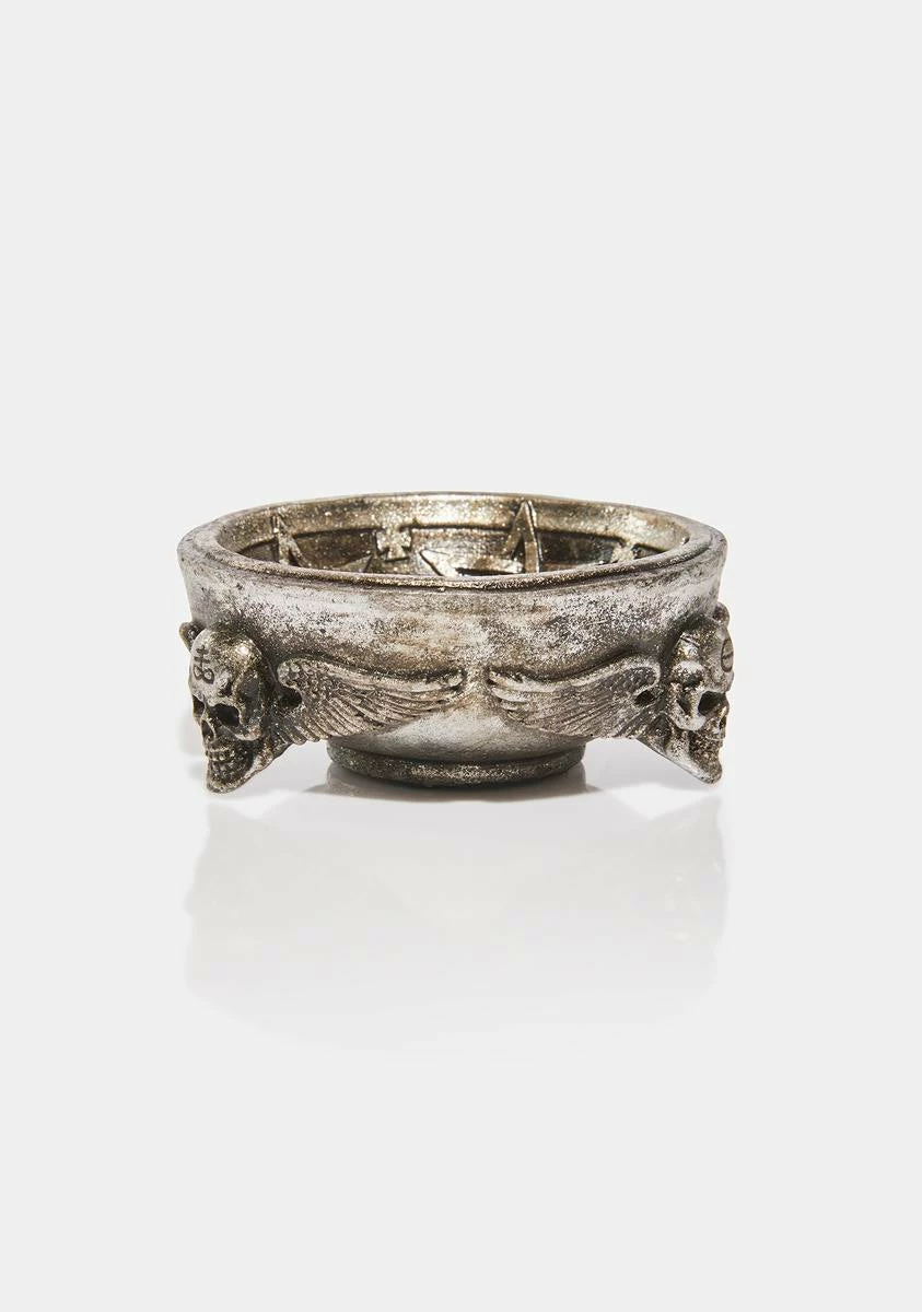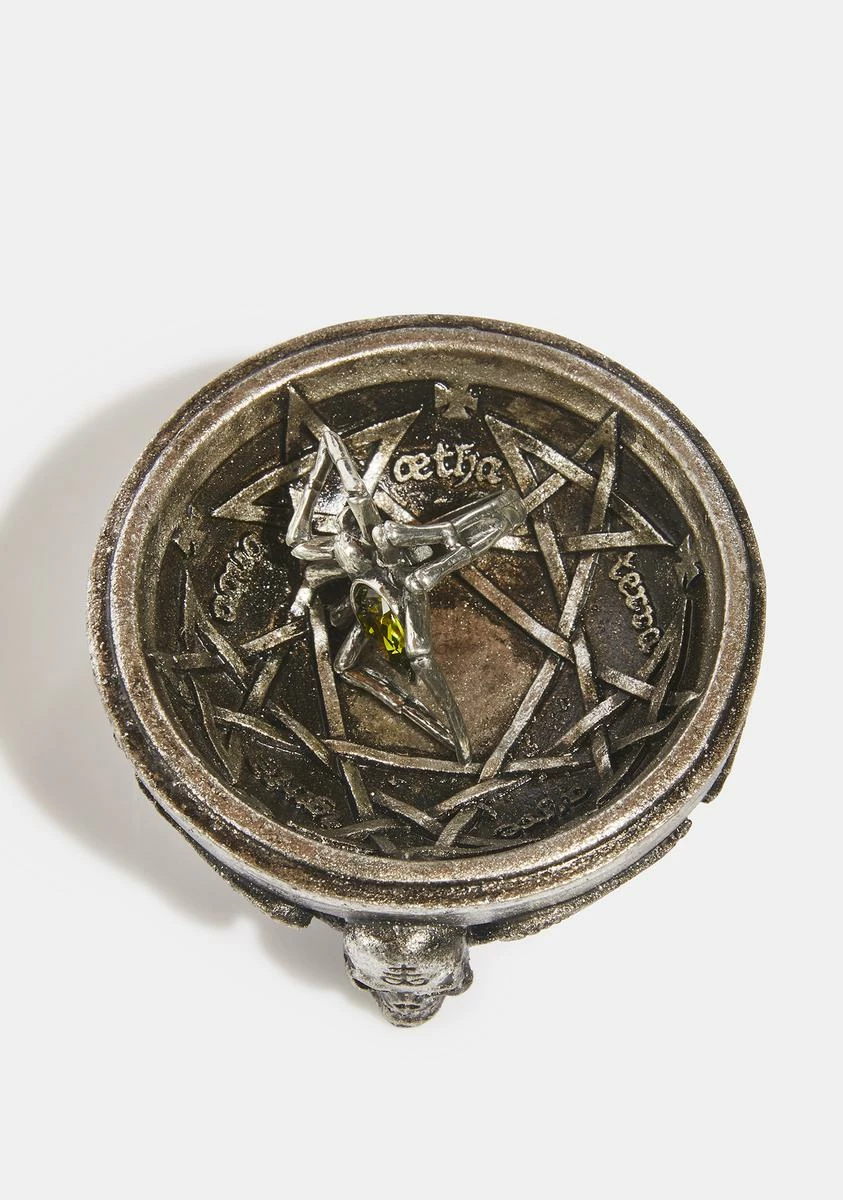 cuz you have an angel on your shoulder and a devil in your head. Store your essentials on this circle-shaped tray that features pentagram details, skull details at outer, and an aged silver-toned finish.
