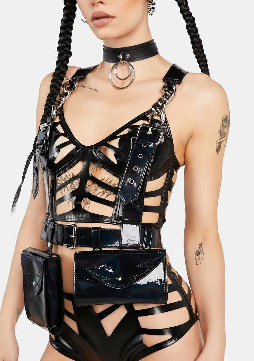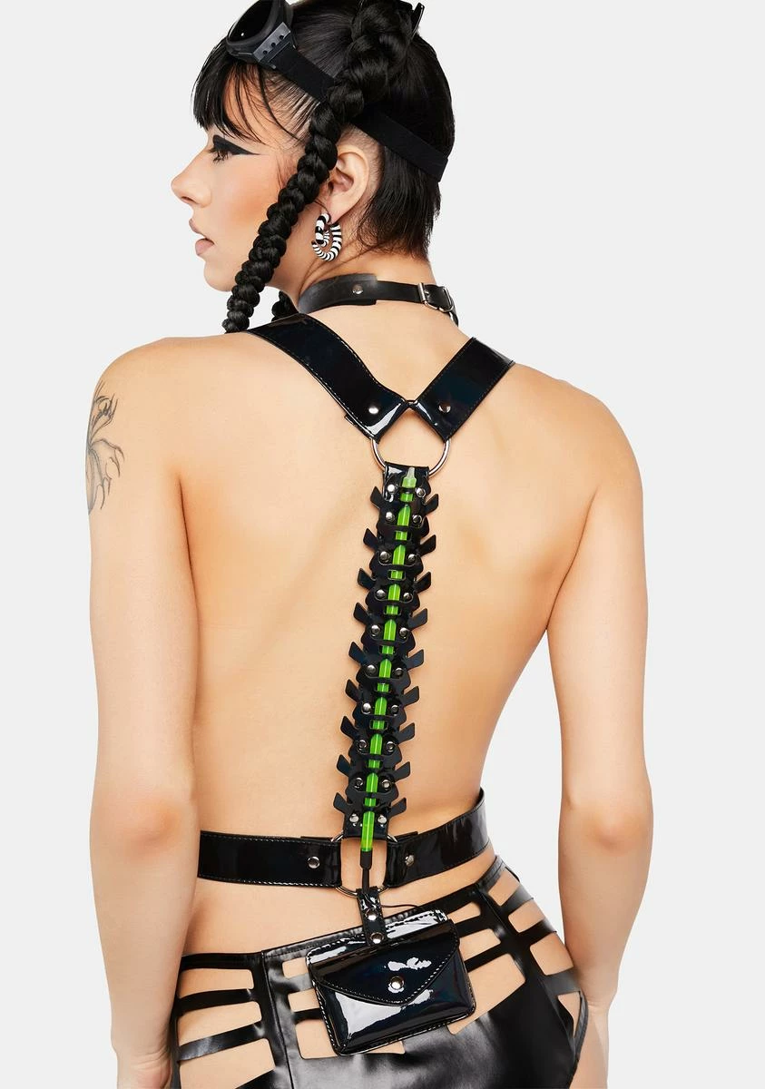 cuz you’ve got magic in your veins. This utility harness has a black holographic vinyl construction, O-ring and chunky chain hardware, adjustable buckle strap closures, two pouch pockets on the front with the wide rectangle one being big enough for a phone, and a green LED light up spine design on the back with three modes: still, blinking, and fade. Batteries are included.