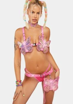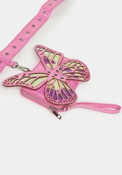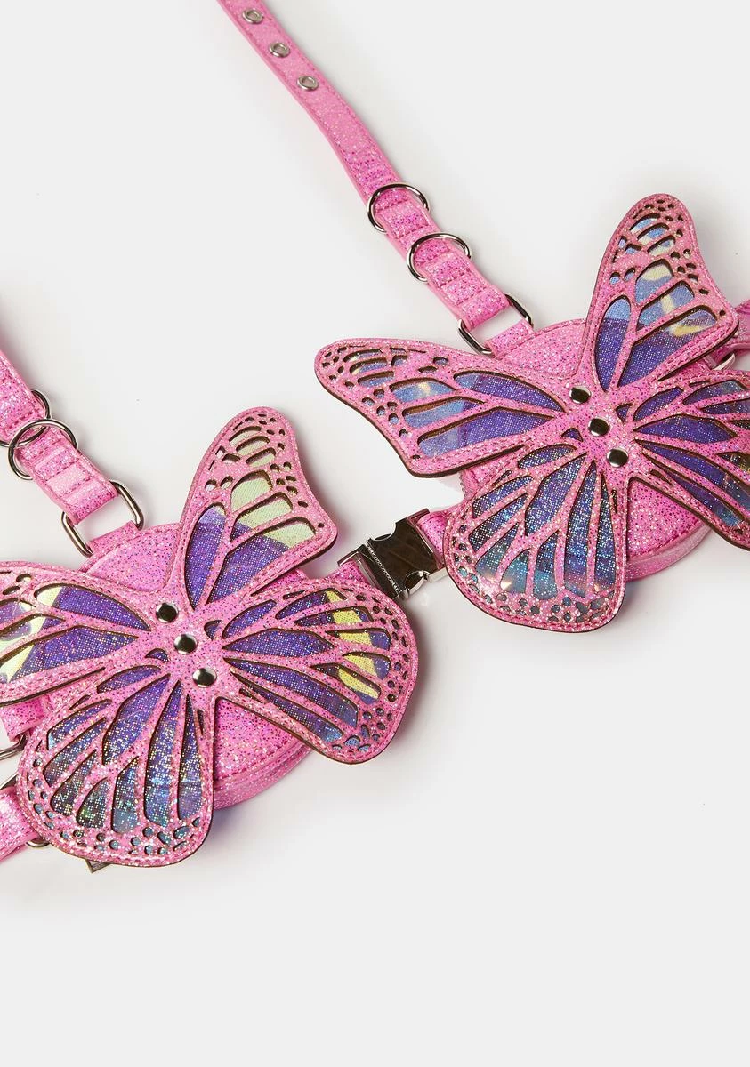 cuz you’re a pretty little electro fairy! This butterfly harness bra top and belted wallet set has a vegan leather construction with glitter all over, zippered storage pockets, adjustable buckle strap closures, and a detachable wristlet design with inner card slots.