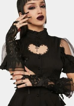 give ’em Mercy vibes. These sheer fingerless gloves have embroidered designs, ruffle trim, and adjustable lace-up ties.