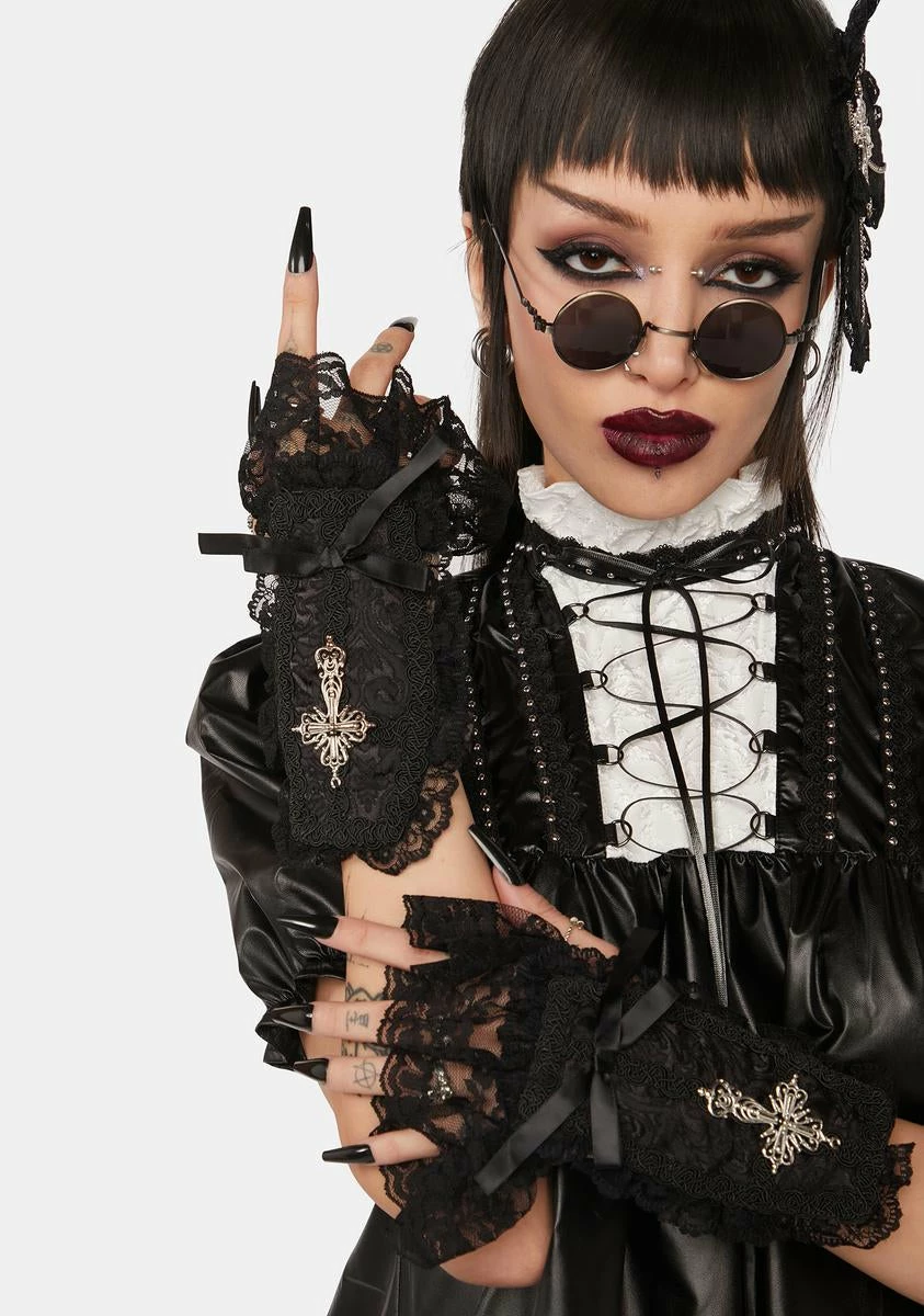 cuz you’re bewitching. These gloves have a floral lace construction, a ruffled trim, ribbon detailing, and a silver cross charm.