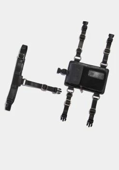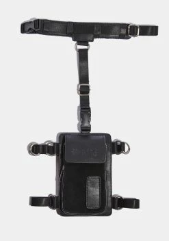 features a vegan leather and nylon webbing construction, D-ring hardware, and adjustable buckle straps. This tactical harness attaches at the waist and has a leg pouch with a zippered compartment.