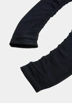 feature logo graphics in contrast white embroidery. These ribbed knit arm warmers have thumbhole cuffs and an elbow length cut.
