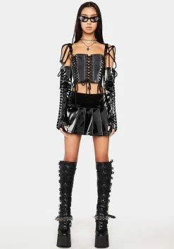 in shiny black vinyl. Lace-up detailing, fingerless design with thumbholes, and zipper closures.
