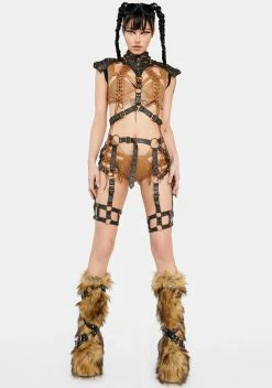 make it known. This vegan leather body harness has a fabric lining, snap button closures on the neck, bronze hardware of spikes and skull studs, a shoulder epaulet design with elastic straps for a secure fit, and adjustable buckle strap closures.