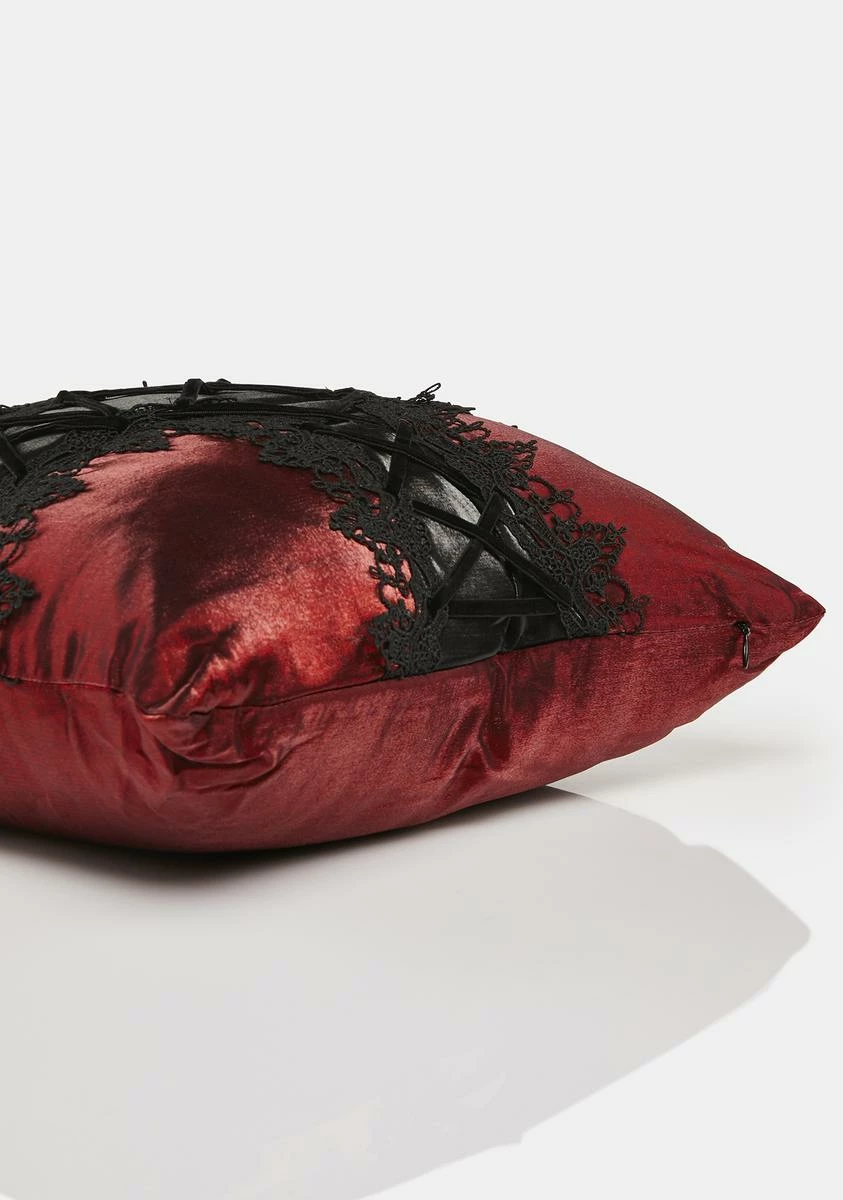 set the tone. This pillow comes in a satin construction, with lace details, and velvet lace up details.