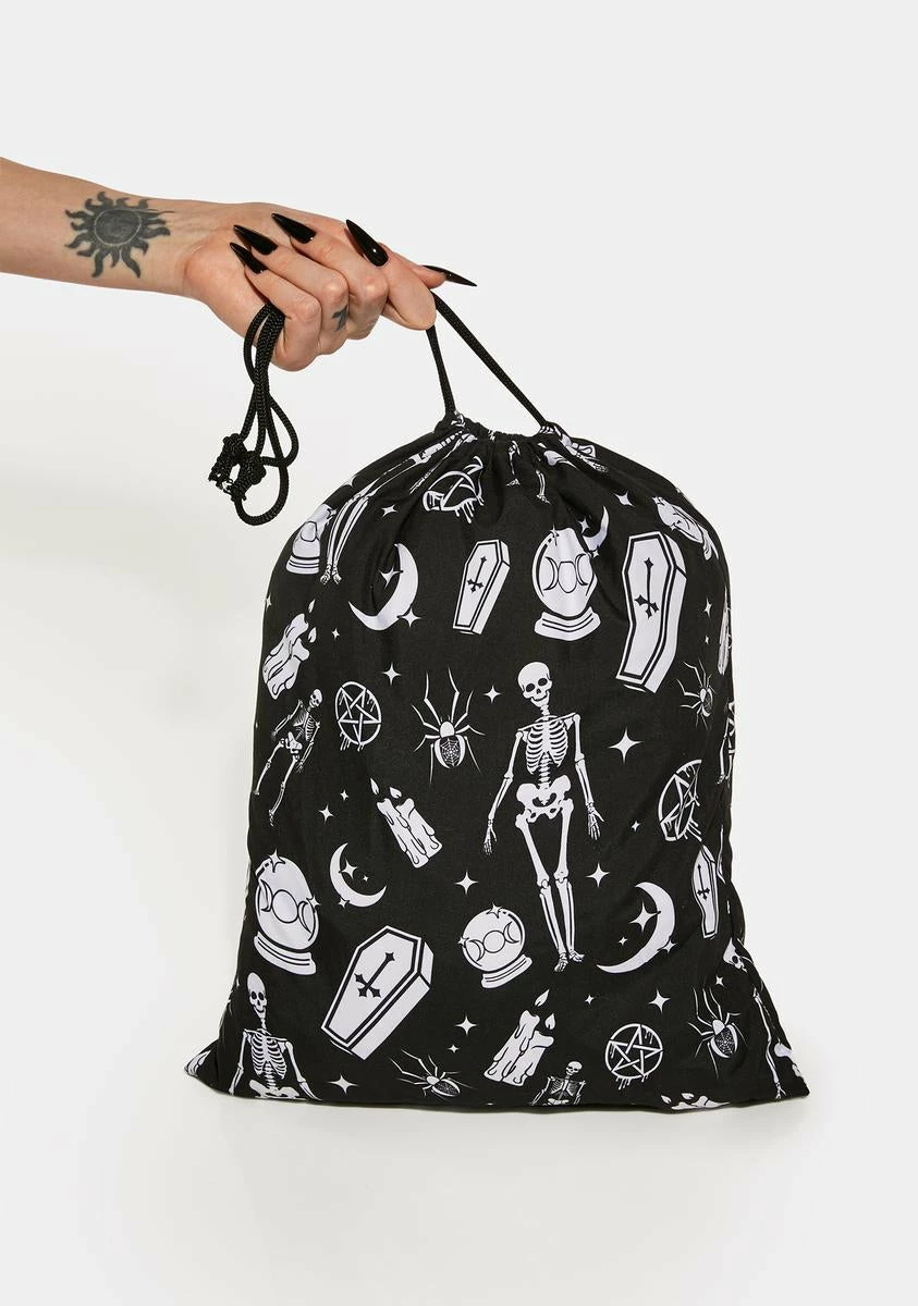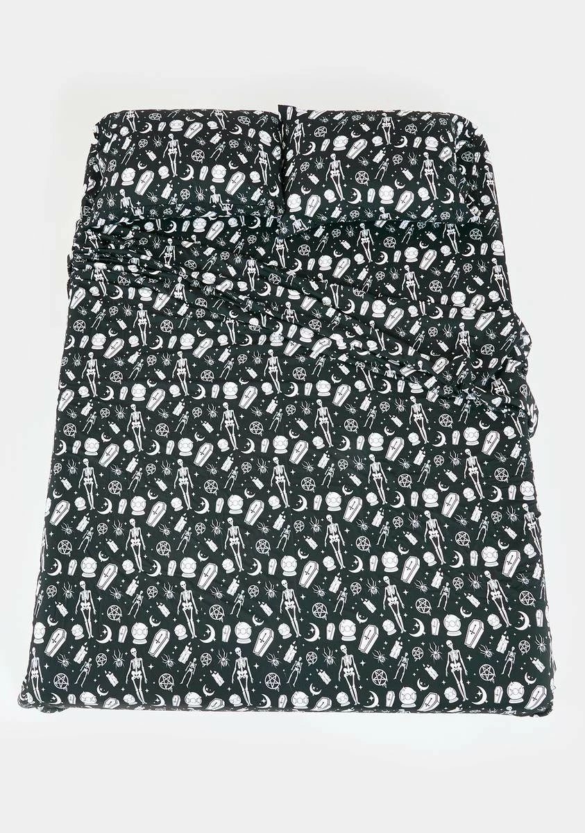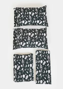 out with the light, in with the darkness. This bedding set comes with one fitted sheet, one flat sheet, a set of two pillow cases, and a drawstring bag, all in a gothic symbol print.