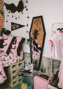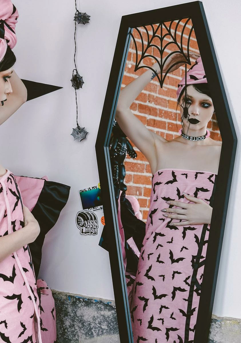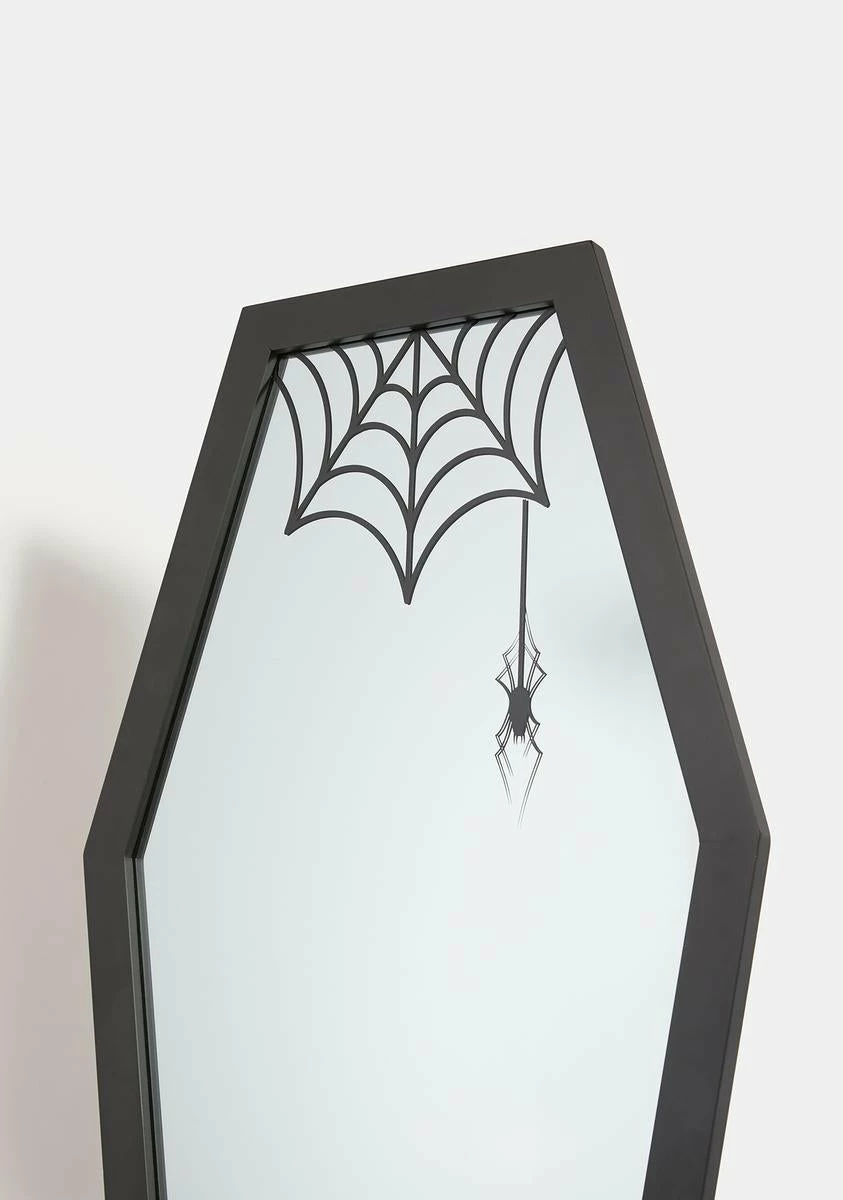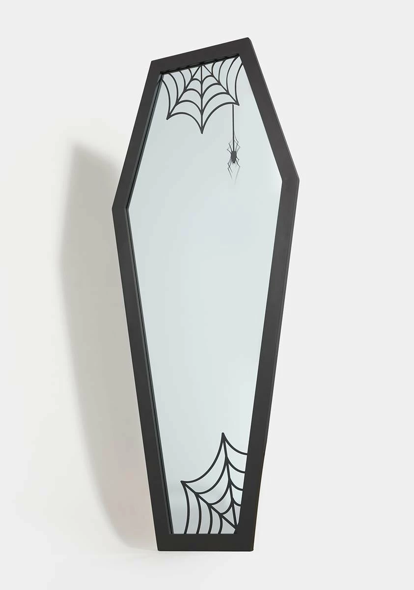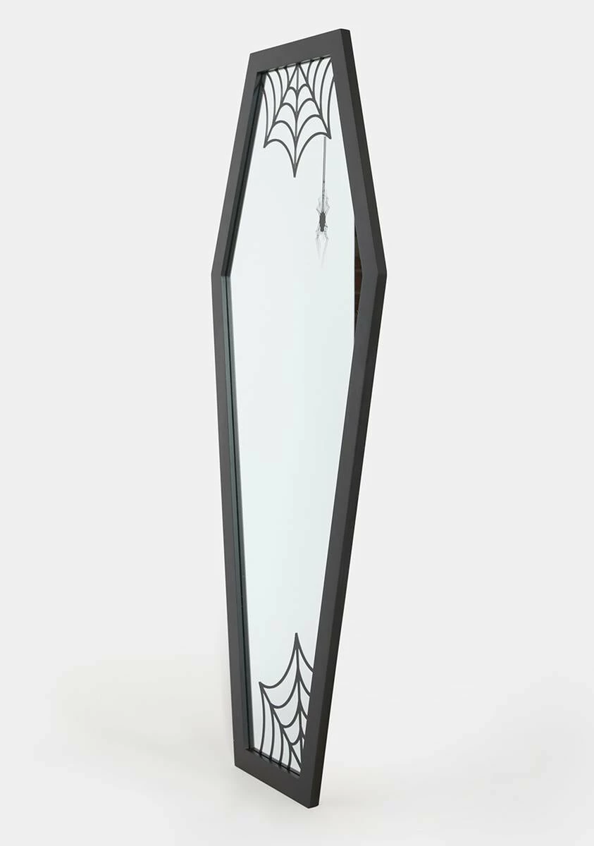 get a look into your future. This mirror comes in a coffin shaped construction, with spider web graphic details. You can hang this mirror using a wall or door mount!