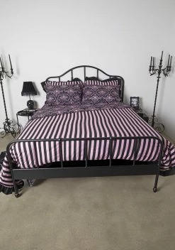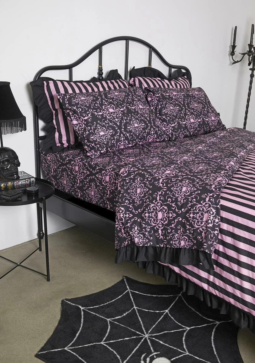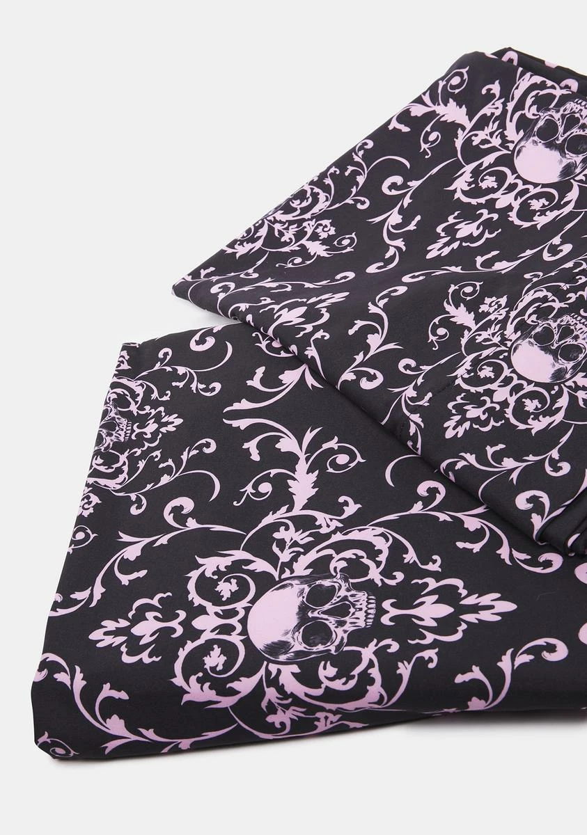 for I know what scares you most. This sheet set has a skull and filigree printed all over. Includes a fitted sheet, a flat sheet, and matching pillowcases.