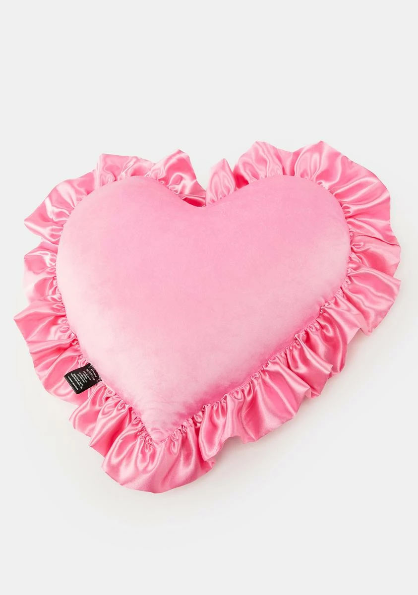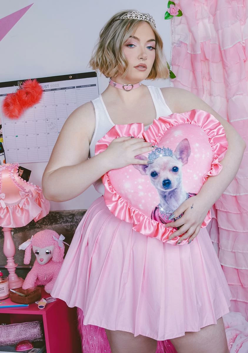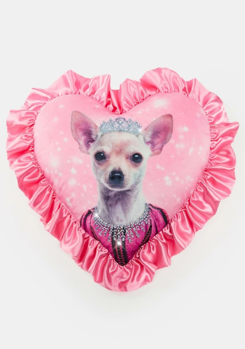 cuz even your pup gets the royal treatment! This pillow comes in a velour heart construction, with ruffle trim satin details, rhinestone accents, and a royal chihuahua graphic at front.