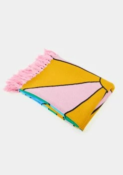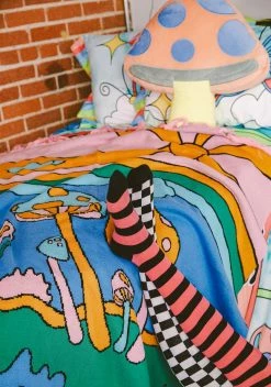 cuz you’re a rainbow beauty. Be a part of a trippy fantasy with this intarsia throw blanket that has a scenic mushroom print all over and pink tassel fringe trim.