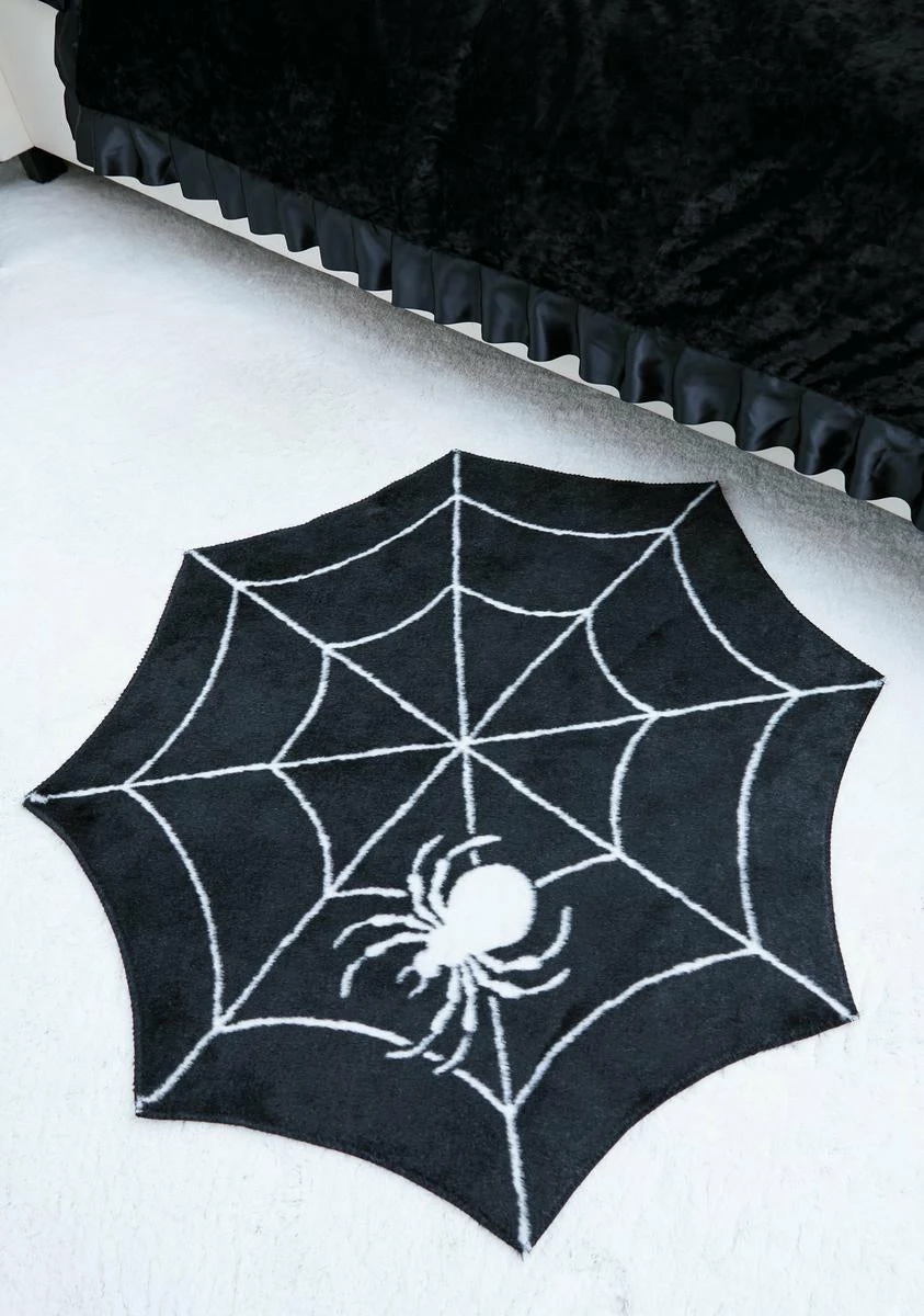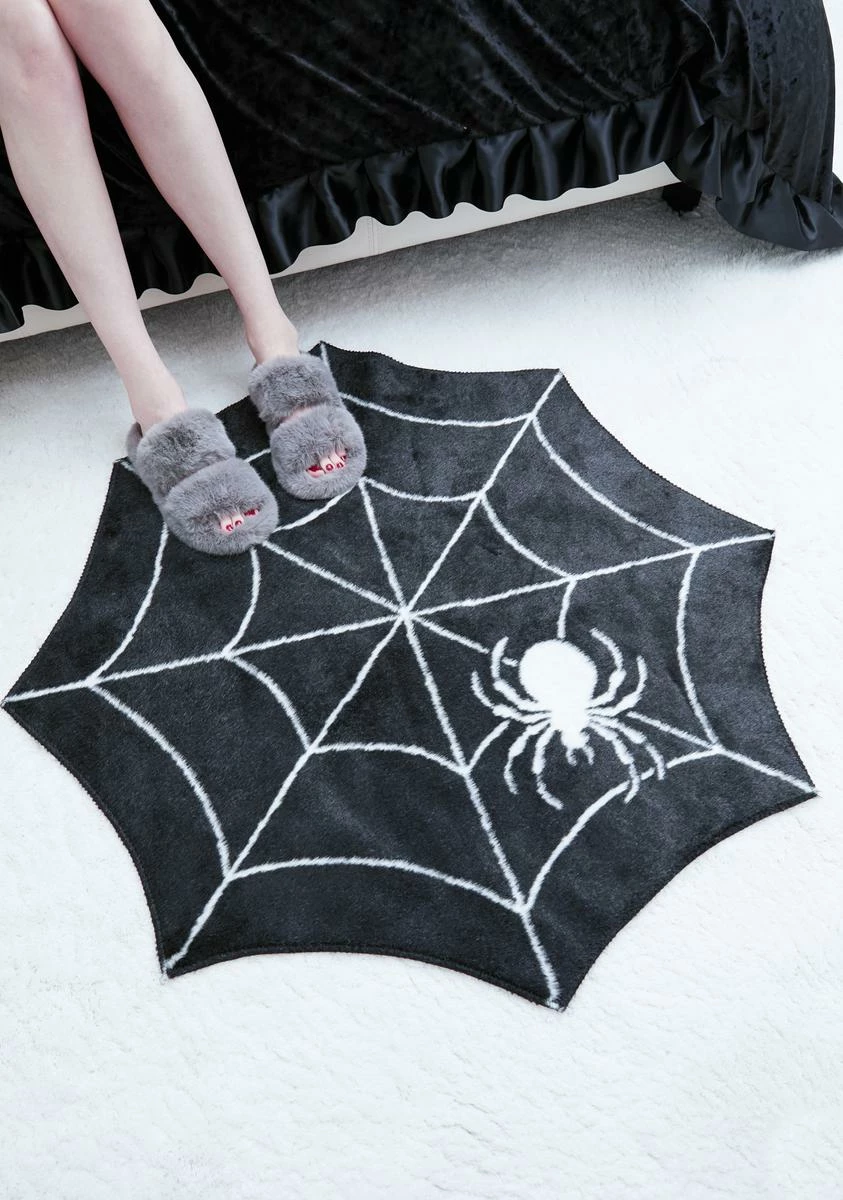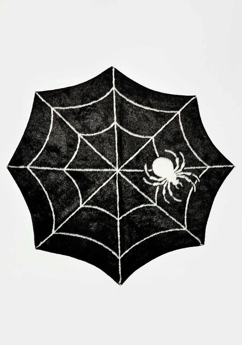 has a soft plushy construction, a spider web shape, and a contrast colored spider web die cut design with a spider on one side.