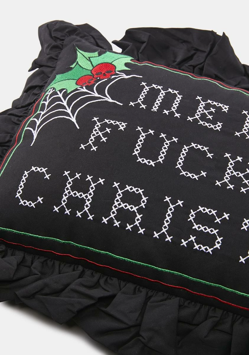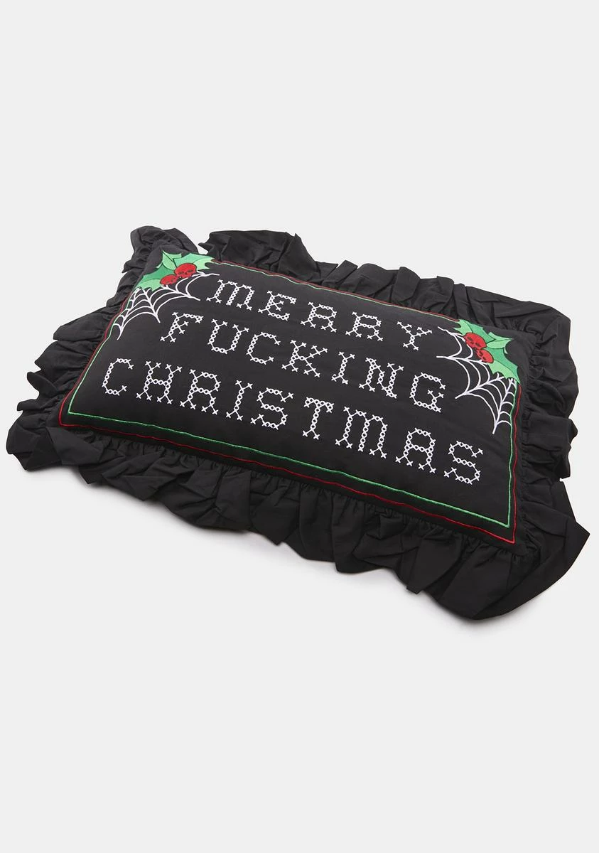 cuz the holidays bring out the best in you. This pillow comes with needlepoint graphic text at front, spiderweb graphics, and a frill trim.