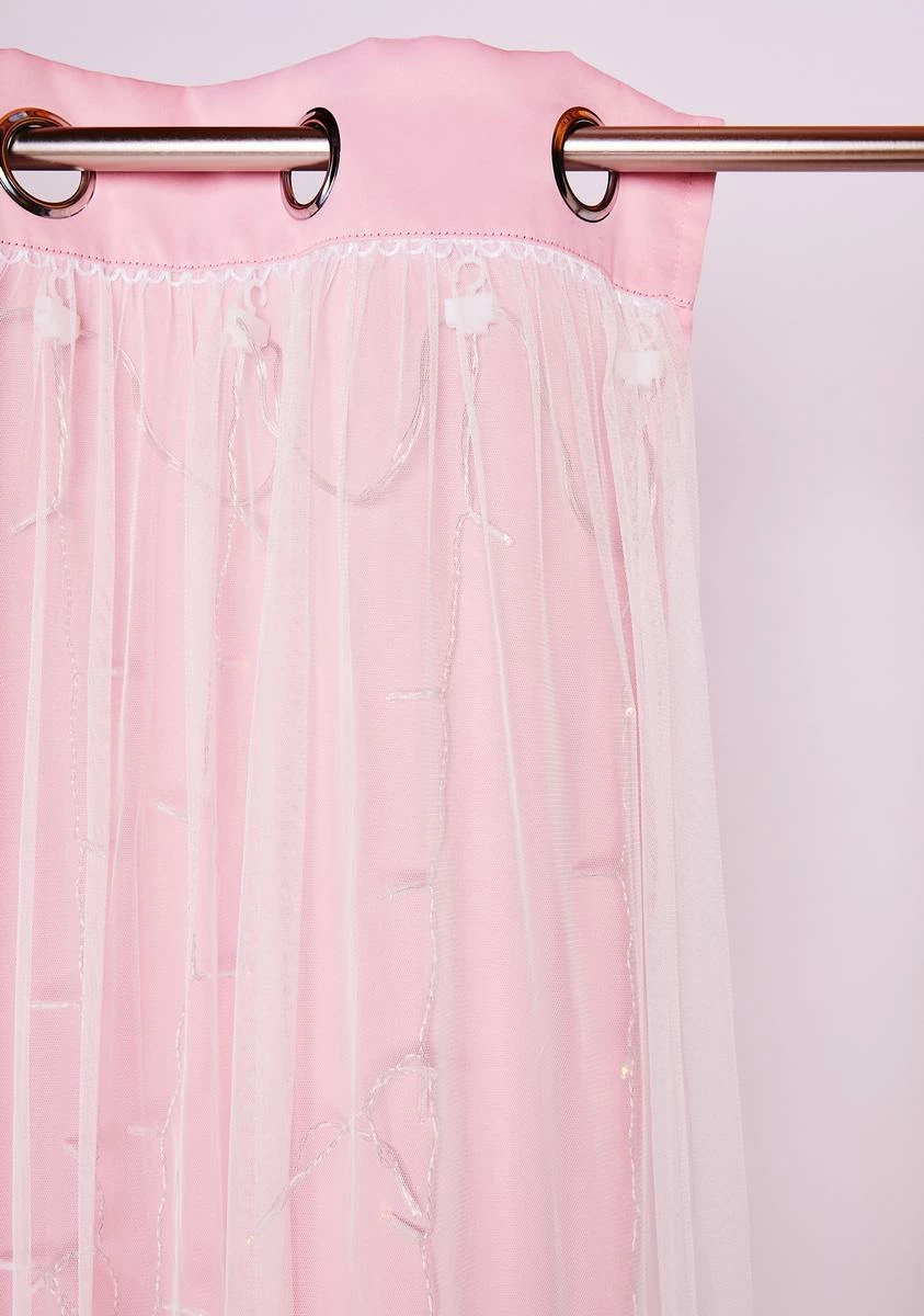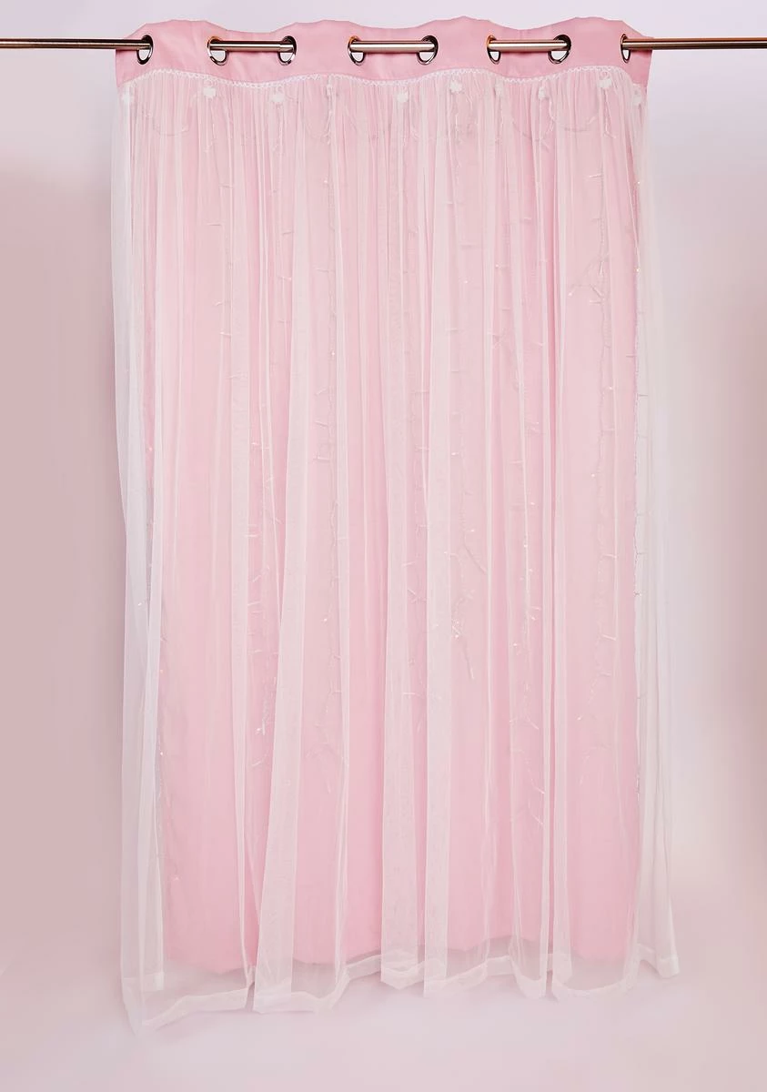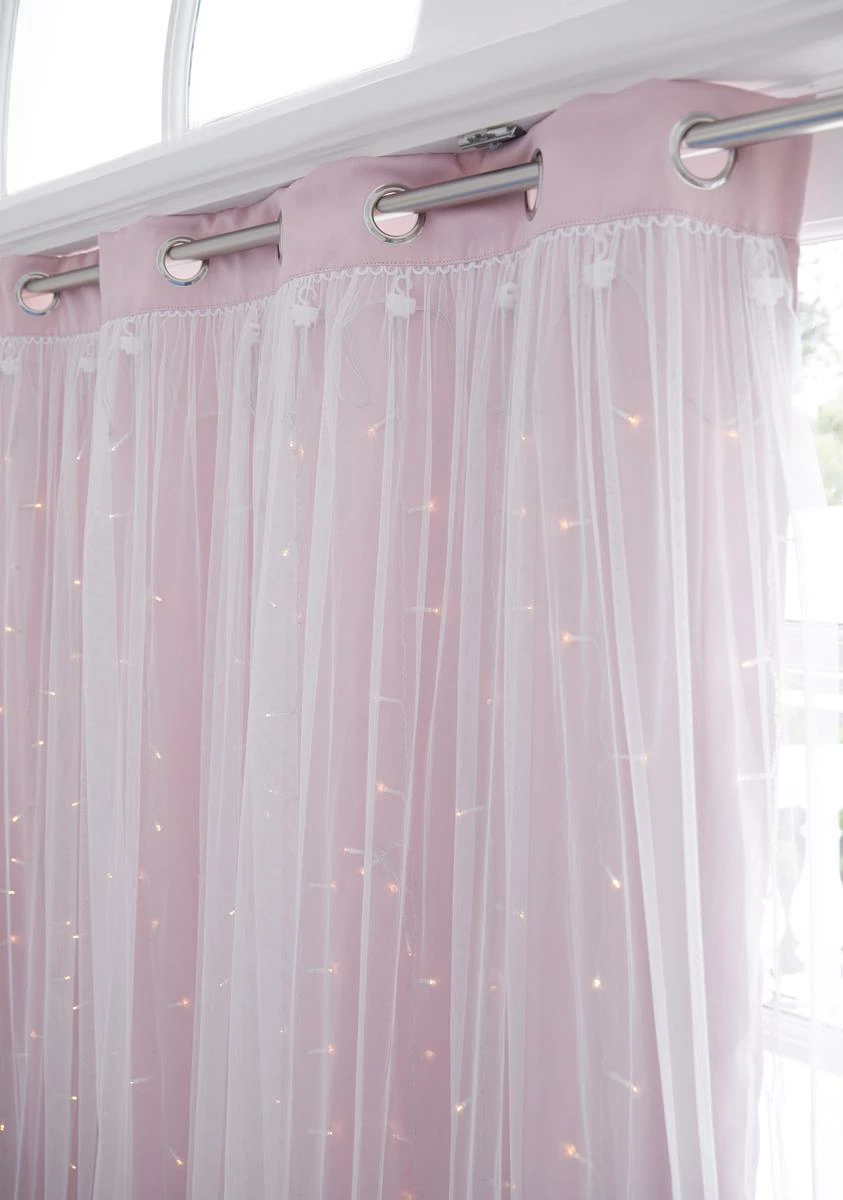 so you can sweeten up your space! These heavy blackout curtains have a double layer sheer panel construction with a tulle overlay, oversized metal grommets, draped lights with remote control light functions that allow you to change between twinkle, dim, or brightness adjustments, a set sleep timer function, and an included USB charged battery pack.