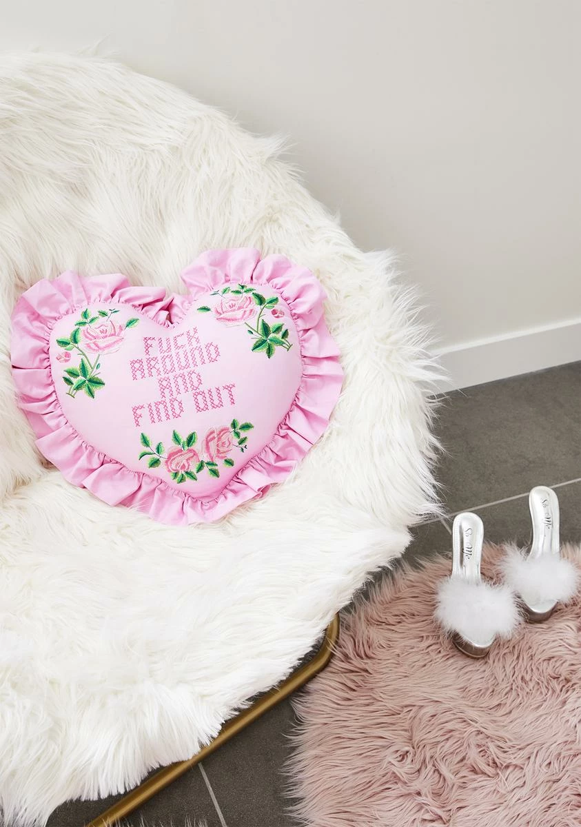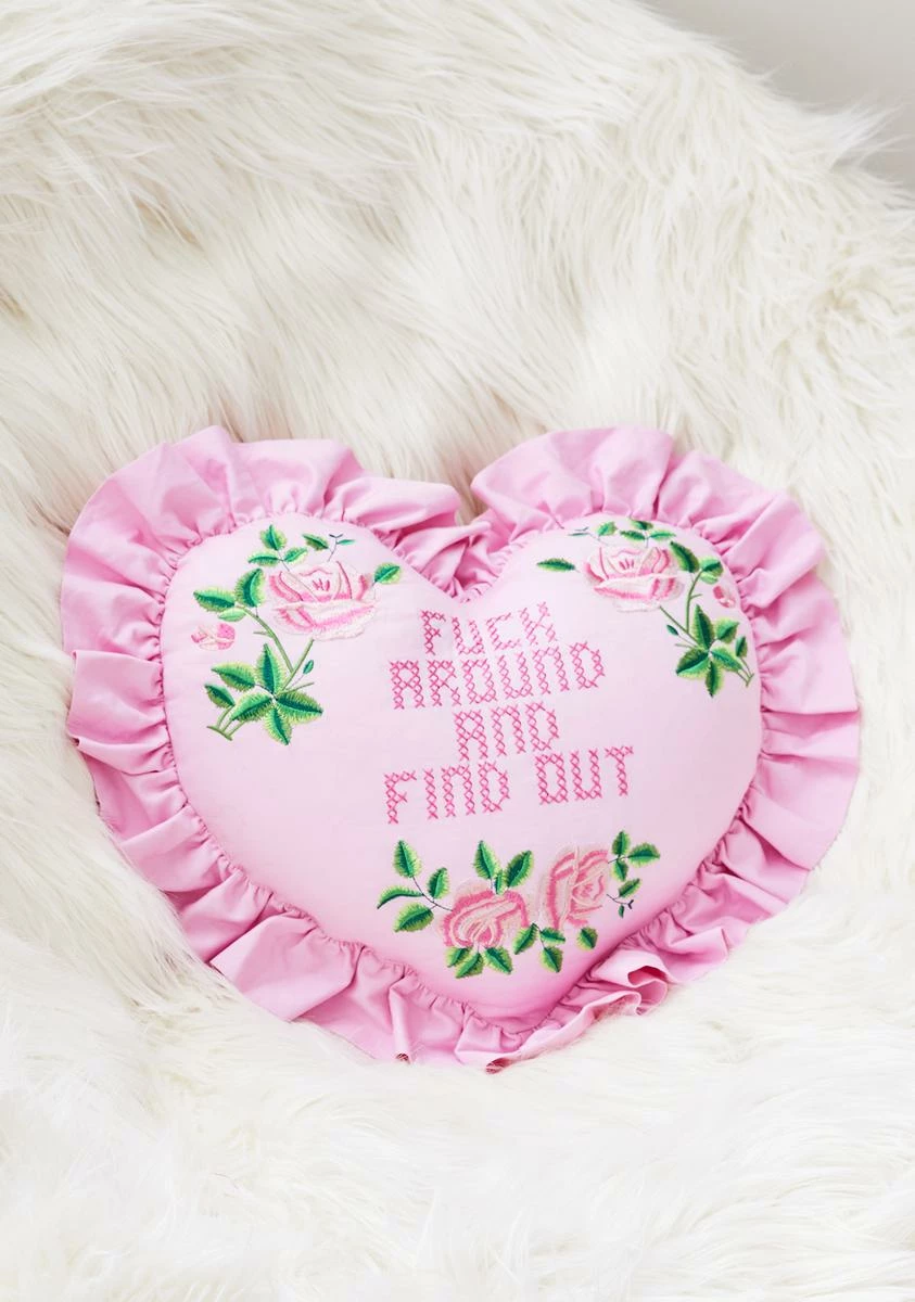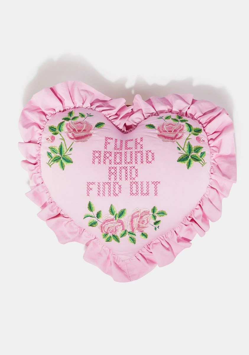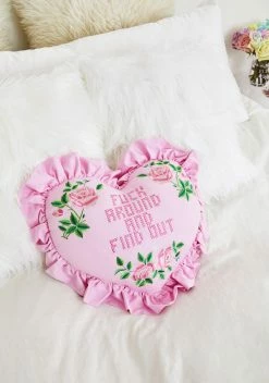 your heart is safe with me! This decorative pillow is shaped like a heart with ruffle trim, cross stitch verbiage across the front, and embroidered rose details.