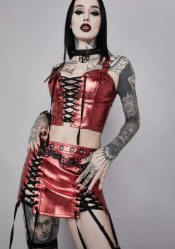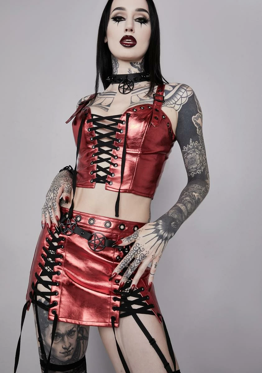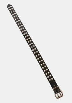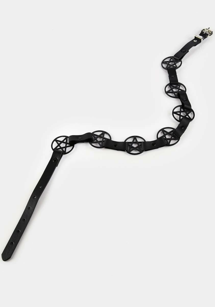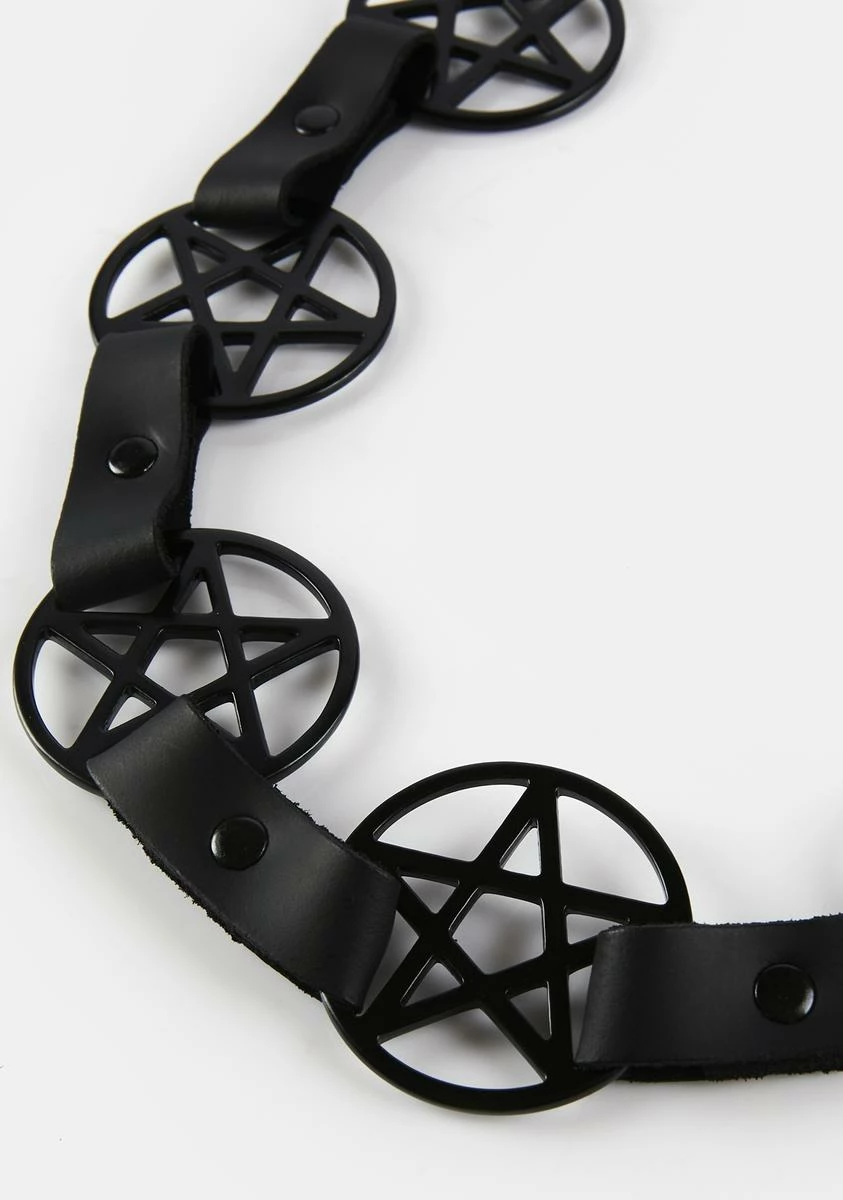 cuz evil lurks. This waist belt has a vegan leather construction, tonal o-ring pentagram charms, and an adjustable buckle closure.