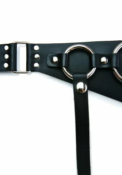 will swing slow and make the passage of time seem endless⦠This amazing belt features a thick black leather strap with large O-rings strung across the front, long garter straps hanging down, and adjustable buckle back closure.