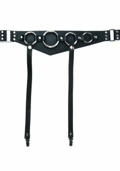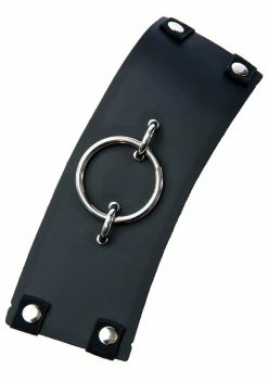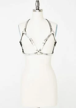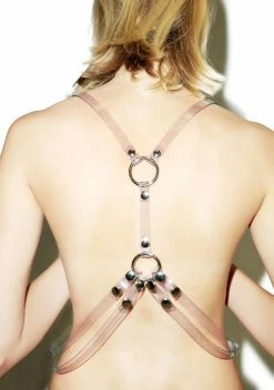 has a paid print all over, silver pyramid stud details, and an adjustable buckle closure with silver grommet hardware.