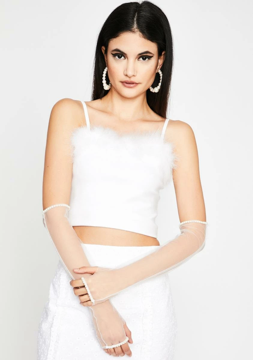 cuz youâre pure magic, bb! Add the perfect romantic touch to any outfit with these glam elbow-length gloves that have a fingerless design, sheer mesh construction, and delicate pearl accents.