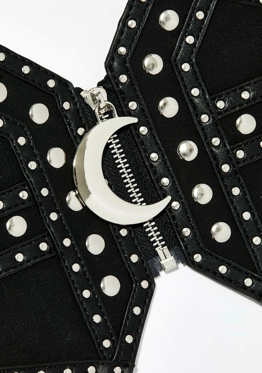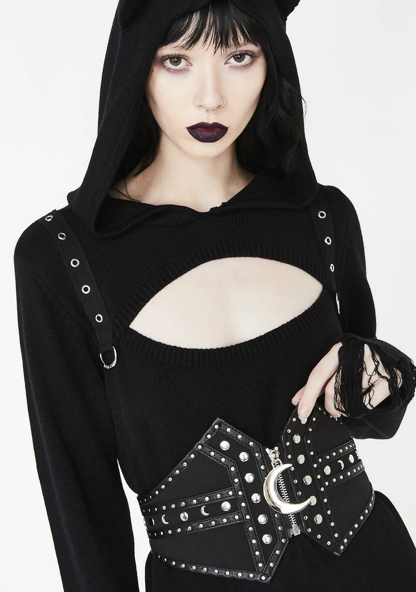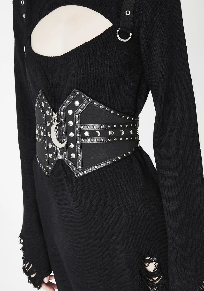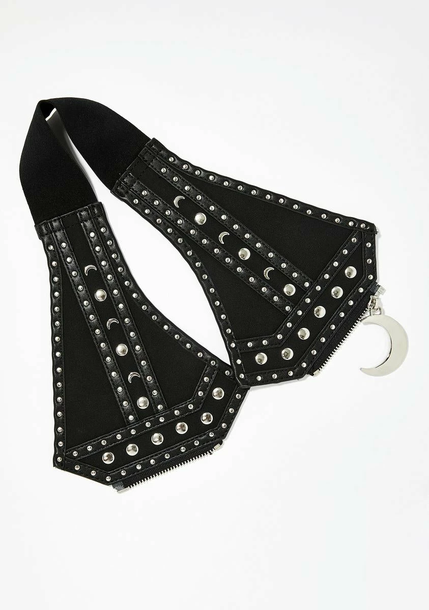 cuz you harness the power of all the stars in the universe. Be queen of the cosmos in this sikk wide waist belt that has stud details all ova and a zip closure with a crescent moon charm.