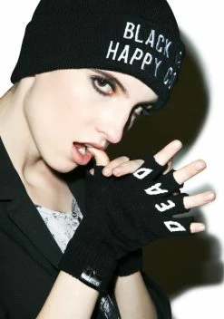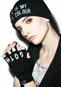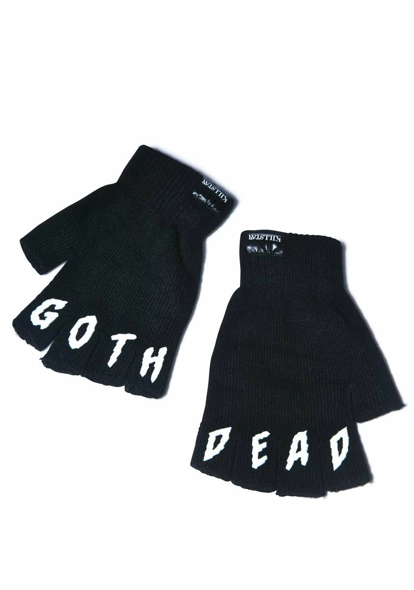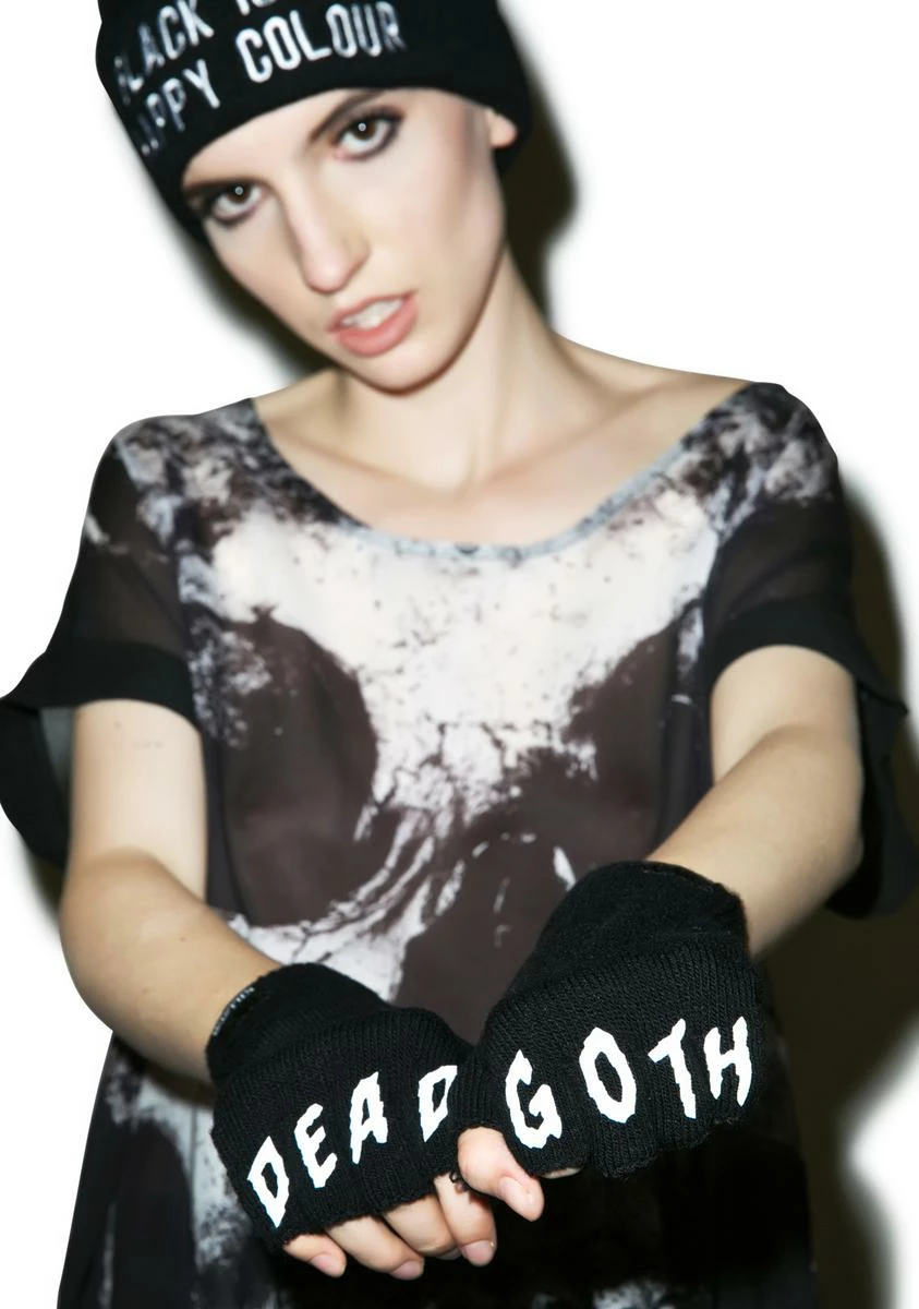 in case all those burninâ candles in yr room arenât warm enough. These fingerless bbâs read âDeadâ n âGothâ across yer knuckles in scratchy white lettering and feature stretchy n snug rib details on yer wrists.
