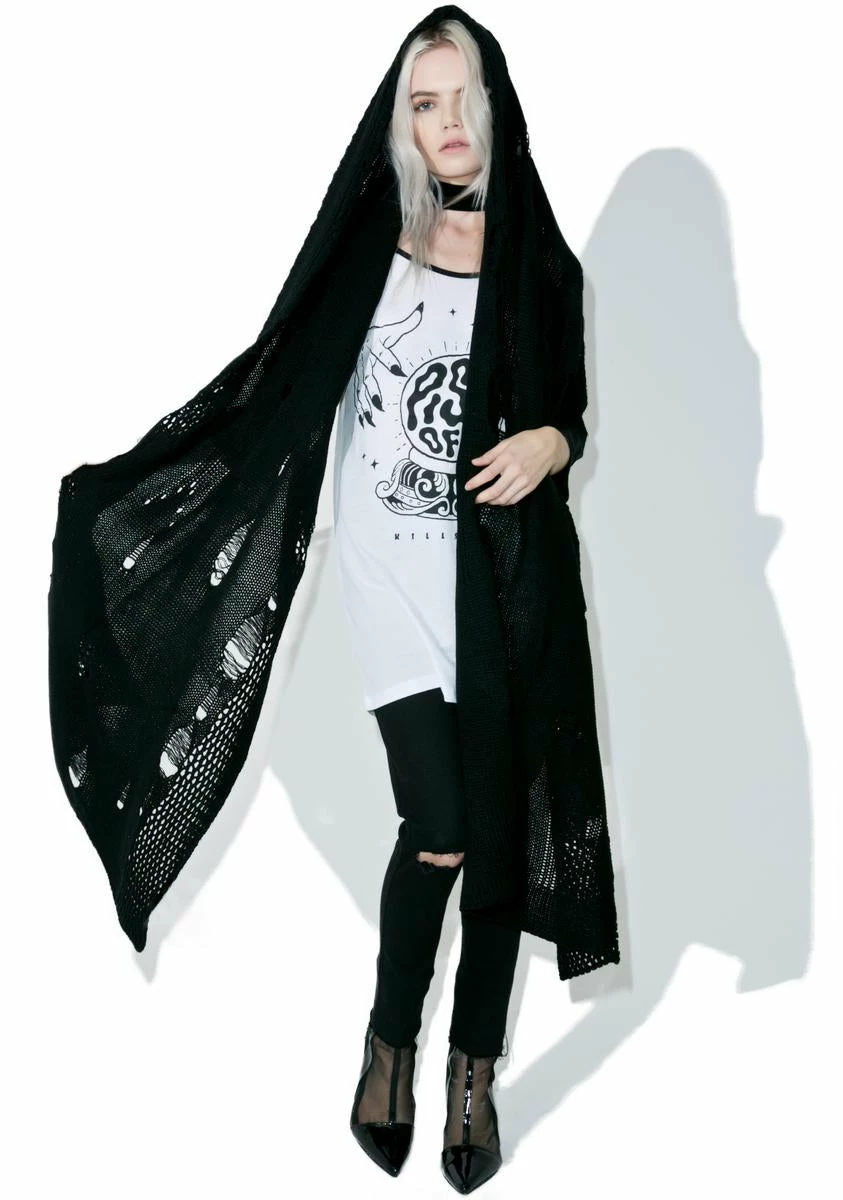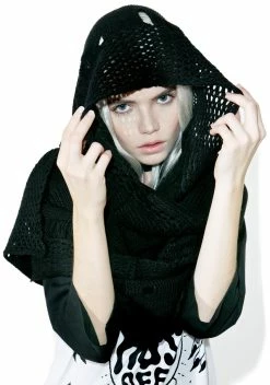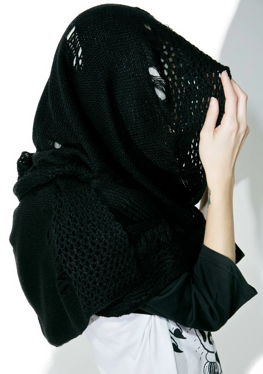 …you donât wanna know what happened to make me like this. Shroud yourself in a thick haze with this amazing scarf, featuring a plush black knit construction with shredded detailing and open stitch panels, eXXXtra long length, and thick âN stretchy style so you can appear however you wish.
