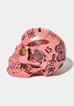 has a high quality resin construction, a skull shape, and a hand painted tattoo flashboard design.