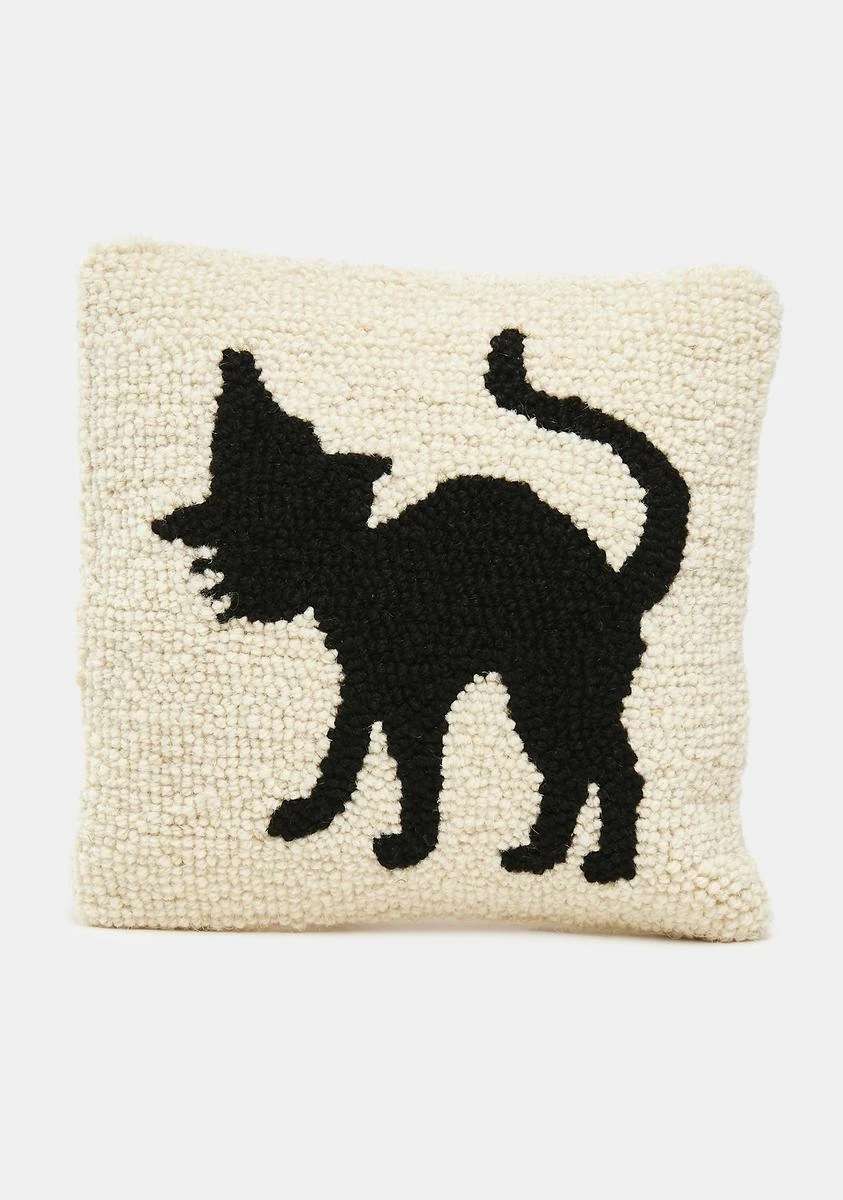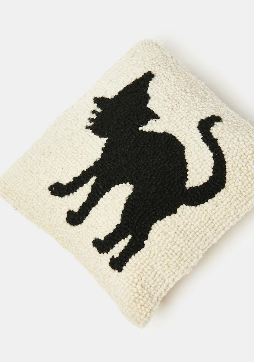 wishing you bad luck. This pillow comes in a wool construction, with a witchy cat graphic at front.