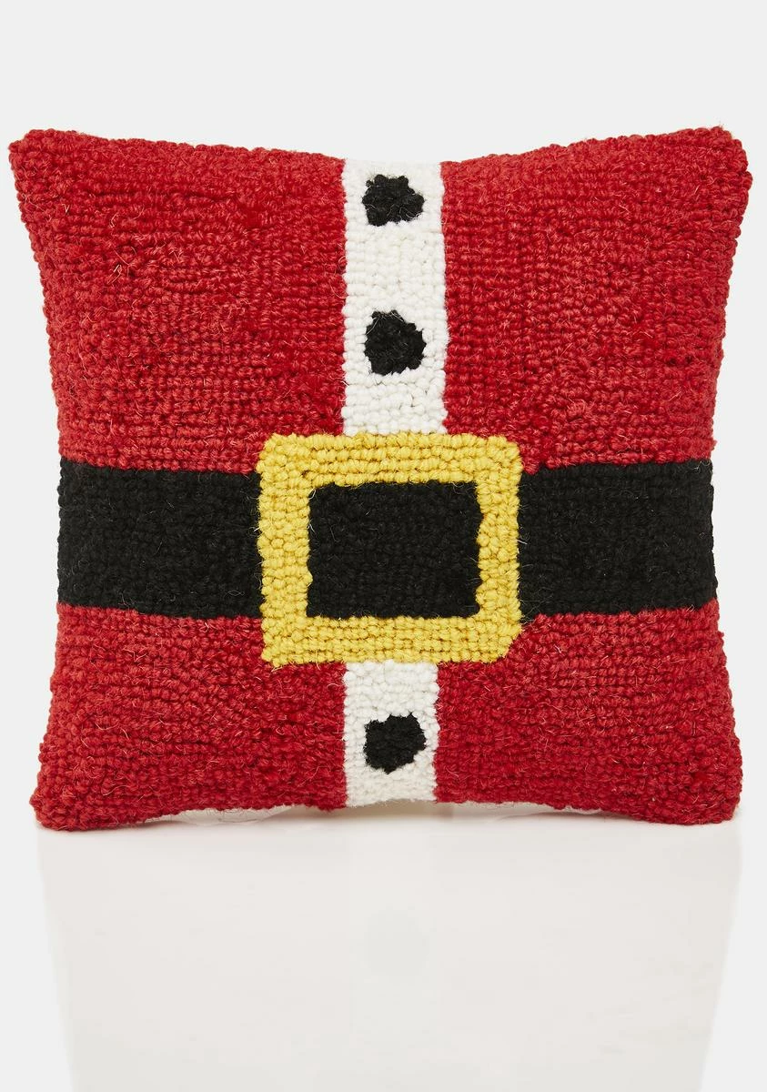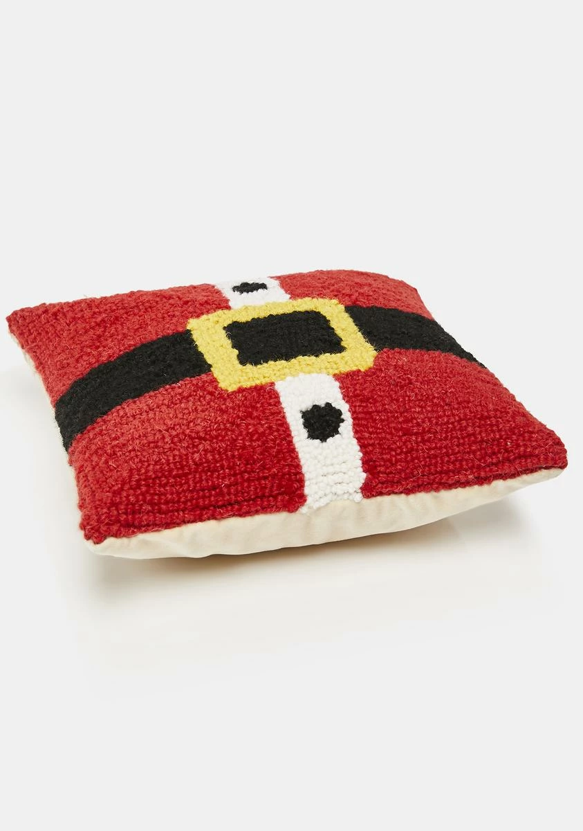 got you feelin’ jolly. This hooked throw pillow has a wool and velveteen construction, Santa’s belt printed at front, a hidden zip closure, and comes with an insert.