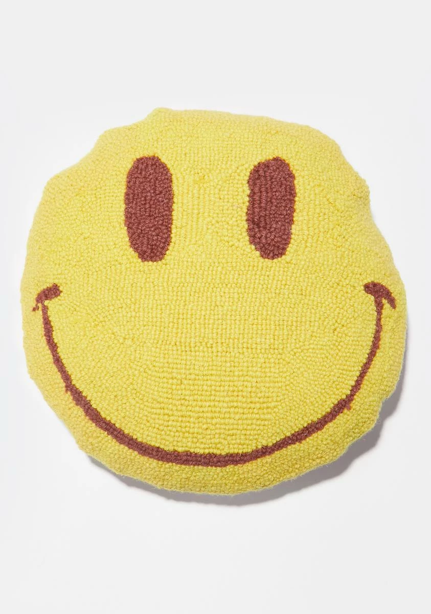 has a fuzzy rug punch texture, a circular shape, and a contrast colored classic smiley face on the front.