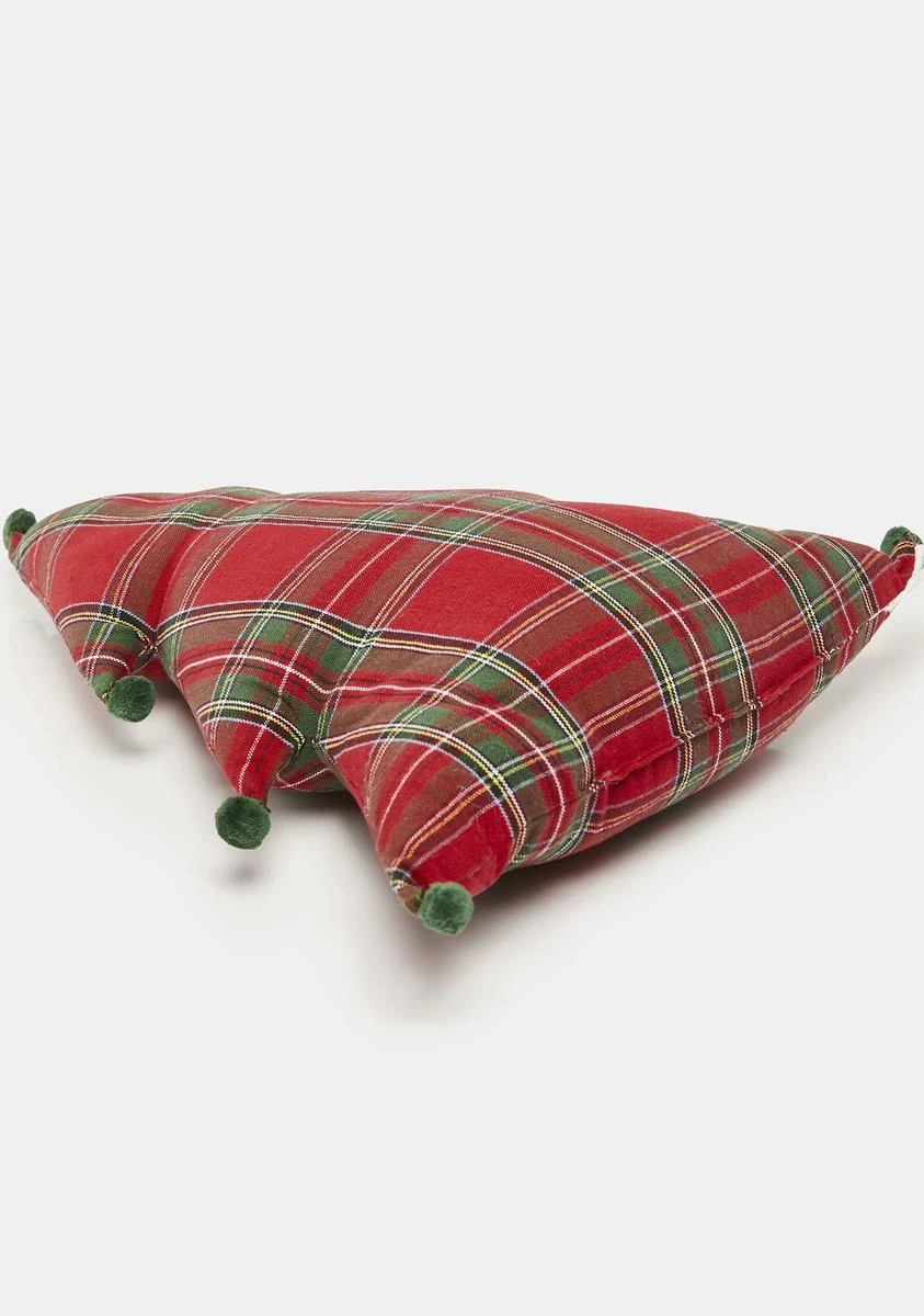 you’re the best pick of the bunch. This Christmas tree-shaped throw pillow has a plaid print all over, pom-pom trim, a non-removable woven cover, and plump filling.