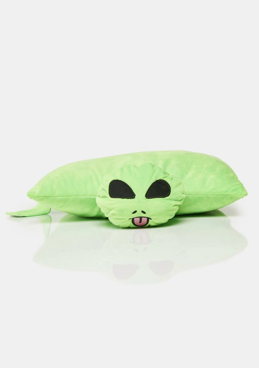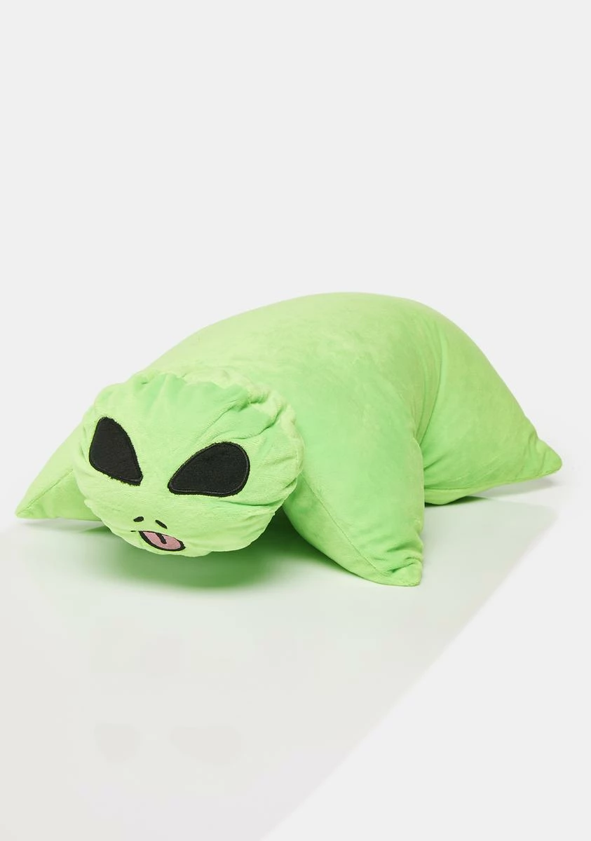 snuggle up with your extraterrestrial bestie. This pillow comes in a plush construction, with an alien head, graphic details, and a velcro strap to extend the alien’s legs.