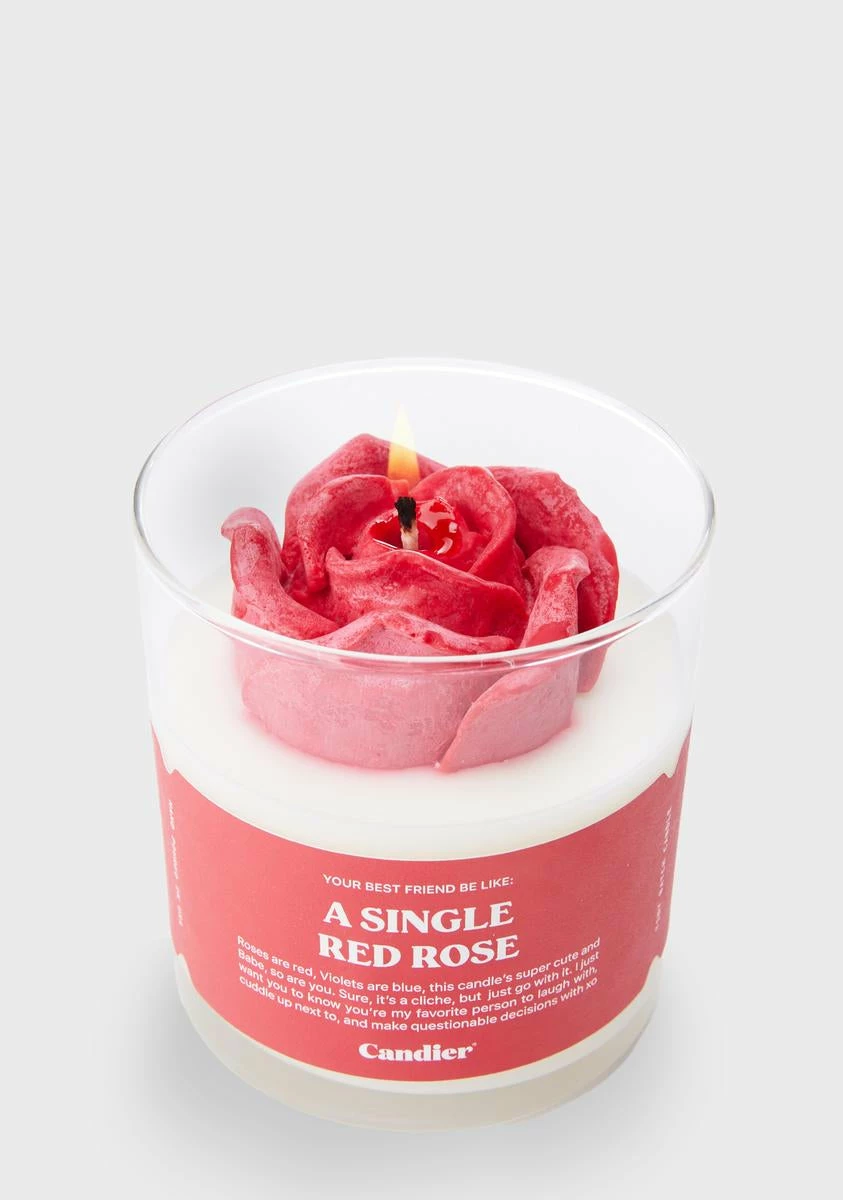 cuz spread the love. This soy wax candle features a red rose on top, has a 60 hour burn time, and smells of fresh cut roses, bubbly champagne, candy, and cream!