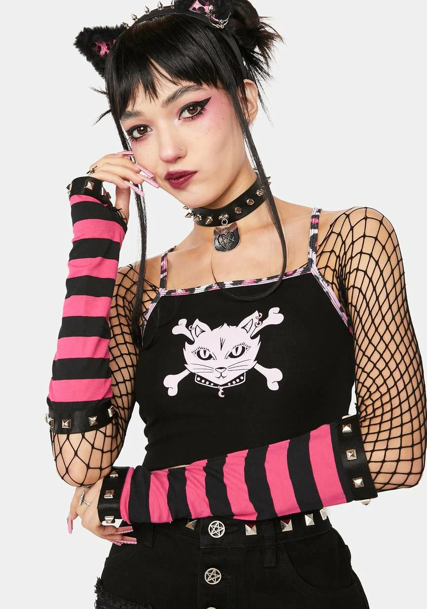 cuz I don’t play nice. These arm warmers come with stud details, in a fingerless construction, and a striped pattern.