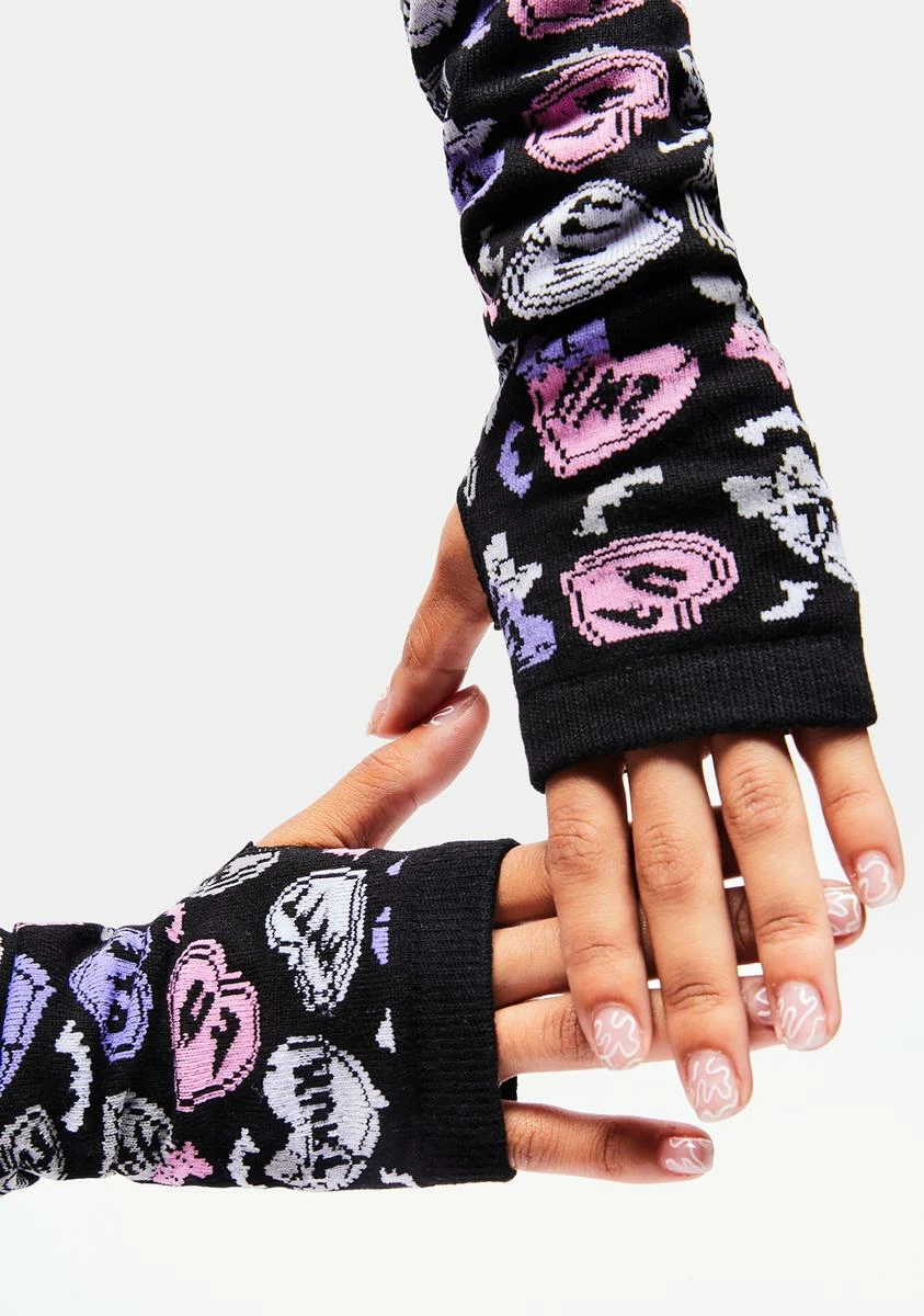 get the message? These fingerless gloves have a knit design, a candy hearts graphic design, and thumb hole cutouts.
