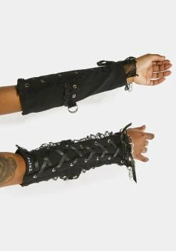 cuz you own the night, babe. These arm warmers have lace trim, chain and D-ring hardware, a fingerless design, and ribbon lace-up details.