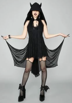 youâve got a date with dracula. This sheer bat wing cape has a hood with ears and d-ring with chain attachments.