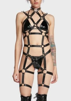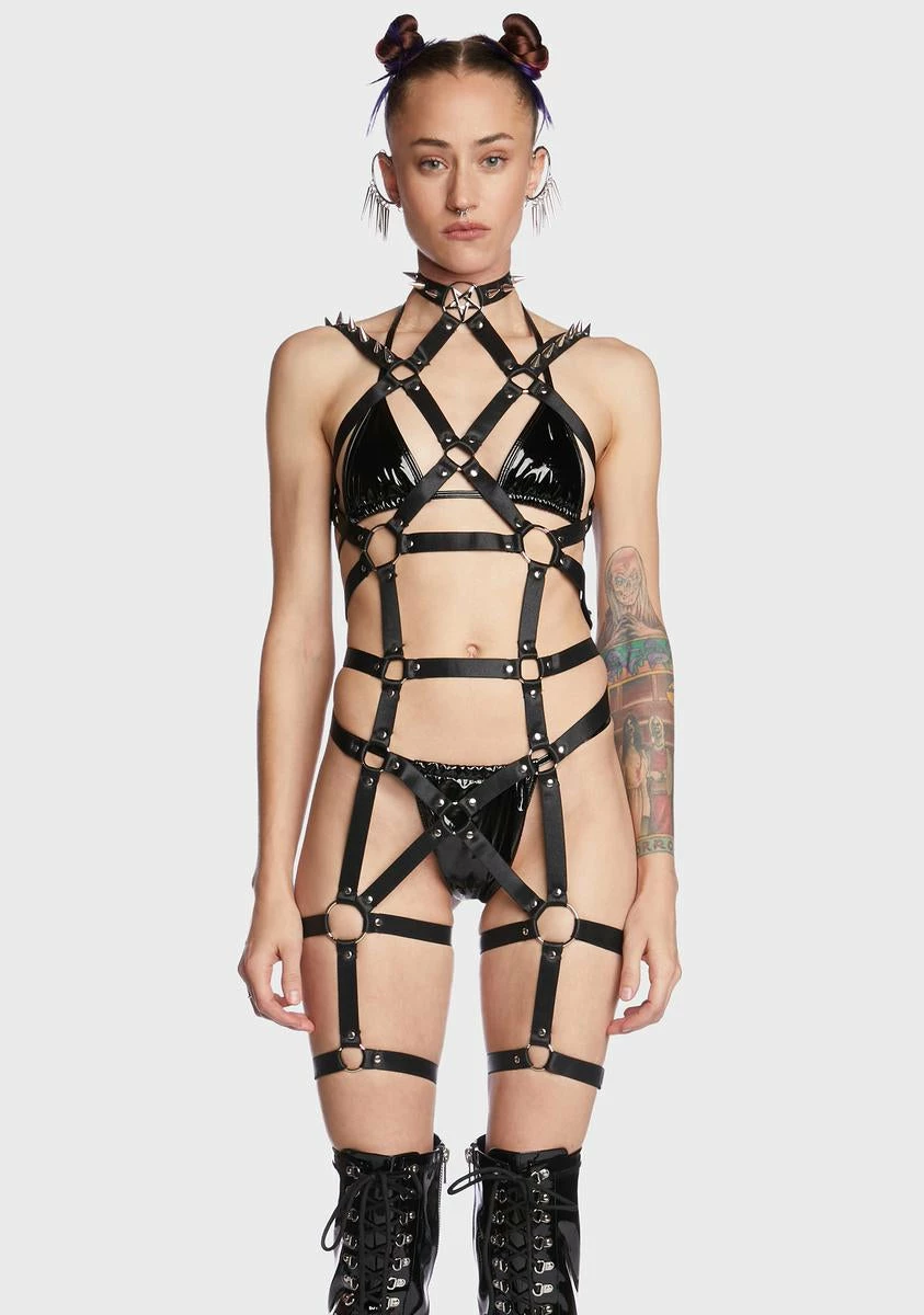 there’s no way out this time around. This strappy full body harness has O-ring hardware, a pentagram star detail at the neckline, spike details, adjustable shoulder straps, and back hook closures.