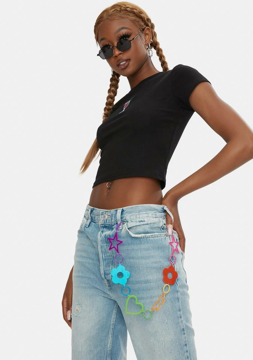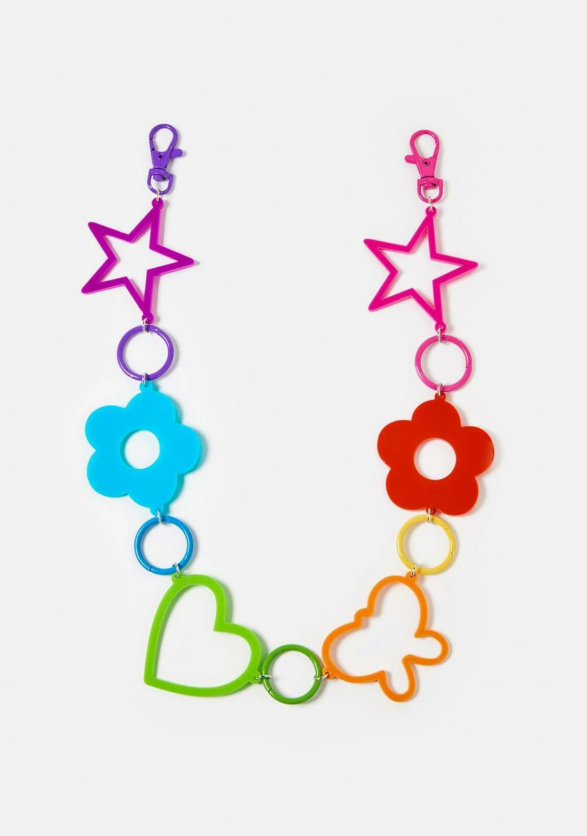 has a rainbow design with star, heart, flower, and butterfly charms.