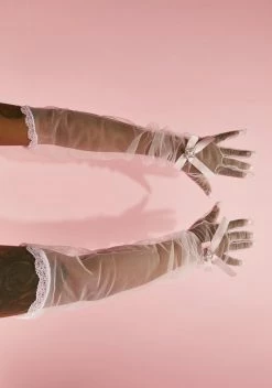 cuz keep it a secret or it won’t come true. These elbow length gloves have a sheer construction, a lace trim, and a ribbon bow with a pearl charm in the center on the front.