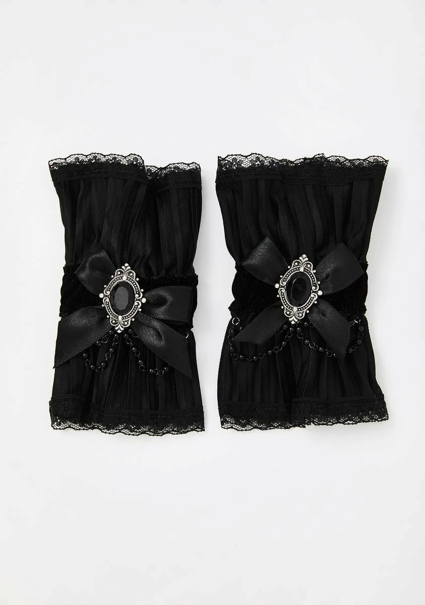 cuz you never give up a grunge! Get into a murderous mood with these wicked arm cuffs that have a ruffled construction with delicate lace trim and gemstone pendants with satin bows Nâ beaded accents.