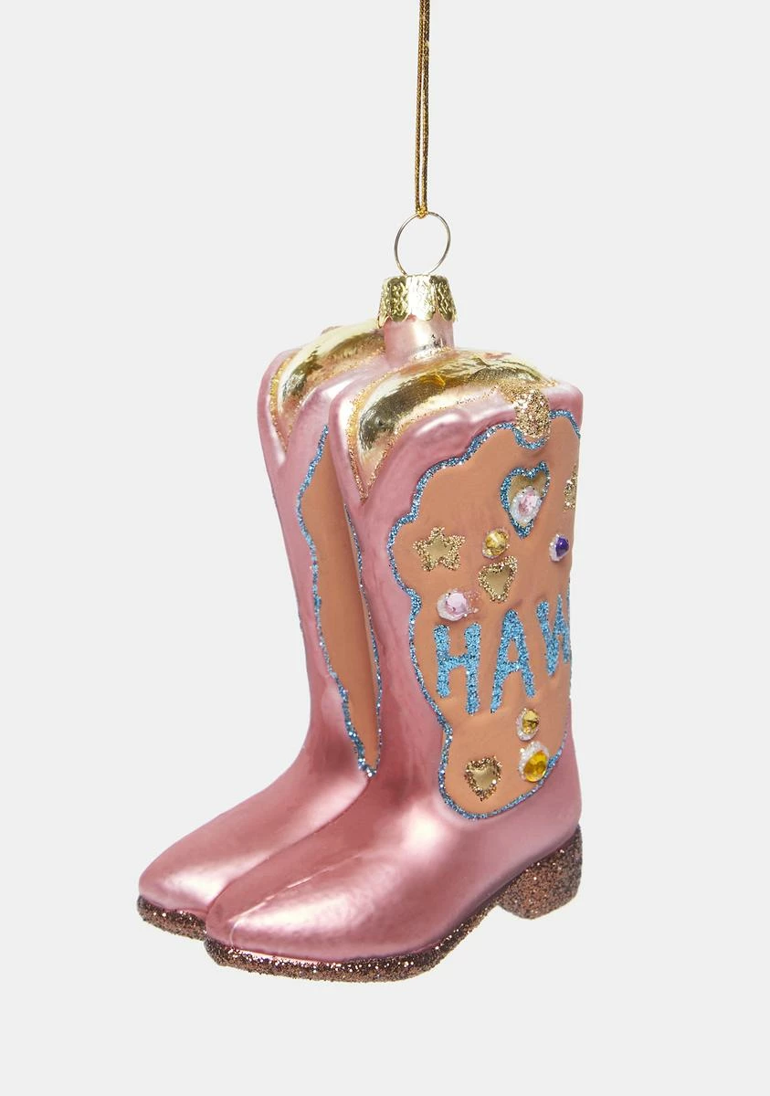 giddy up. This ornament comes in a cowboy boots construction, with glitter details embellishments, and a string for hanging.