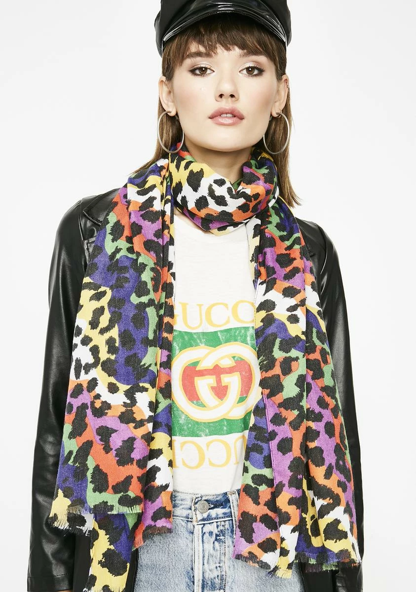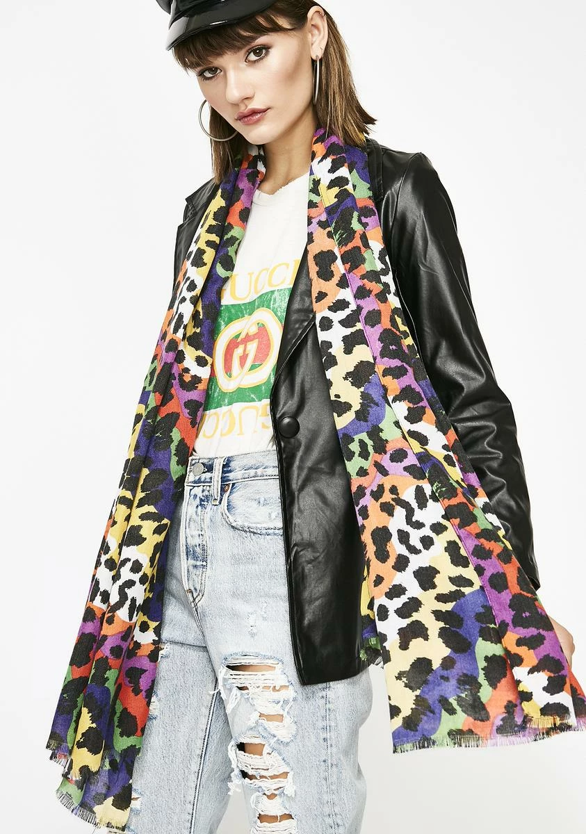 cuz looking good is habit babe! Serve fierce lewks in this rainbow scarf that has a leopard print all ova and a fringe trim.