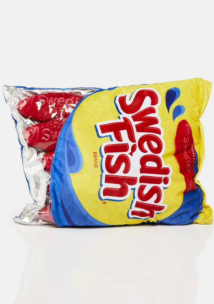 cuz it’s time for a snack! Make your favorite snack your favorite pillow with this fleece plush in the shape of a Swedish Fish bag with 5 removable fish inside, embroidered detailing, a super soft fleece material, and a zipper closure.