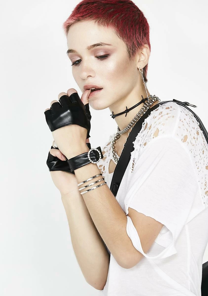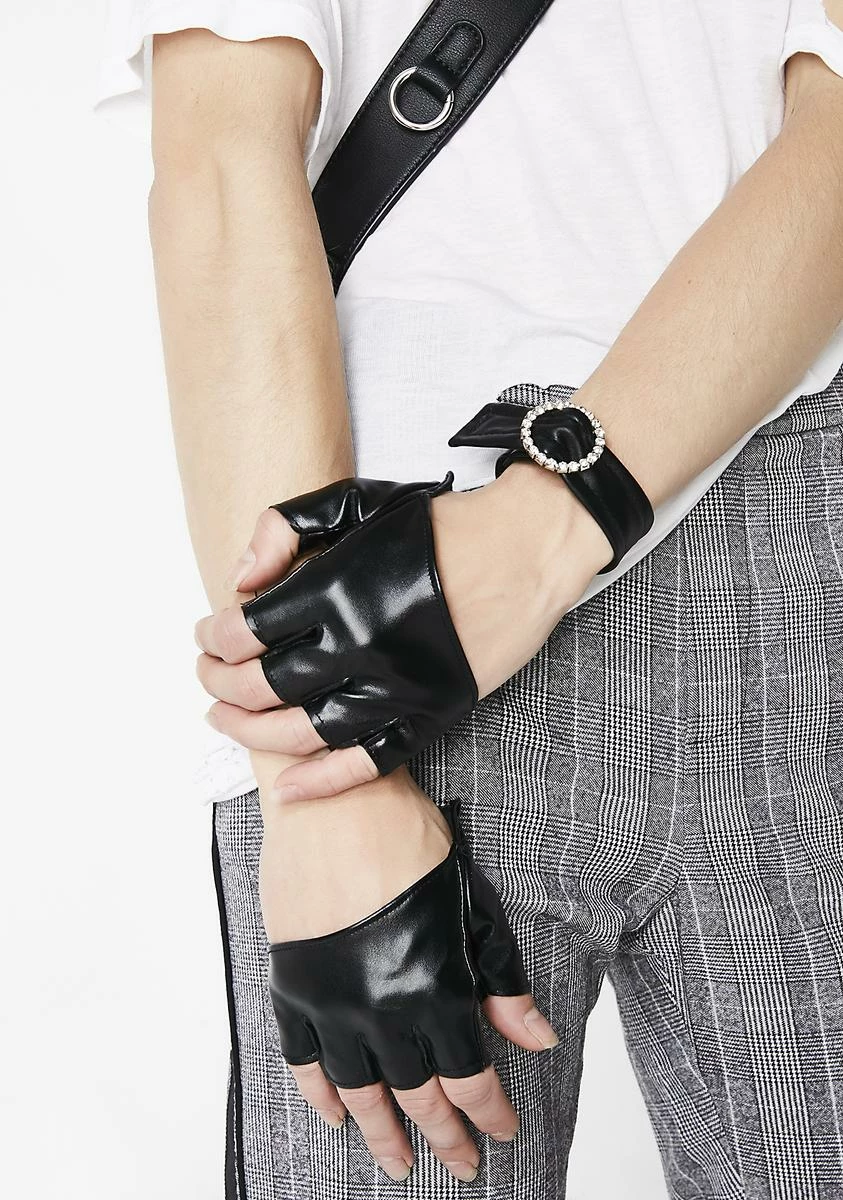 cuz you just go with the flow, bb. Live the good life with these cut off vinyl fingerless gloves that have a wristband with a rhinestone buckle detail.