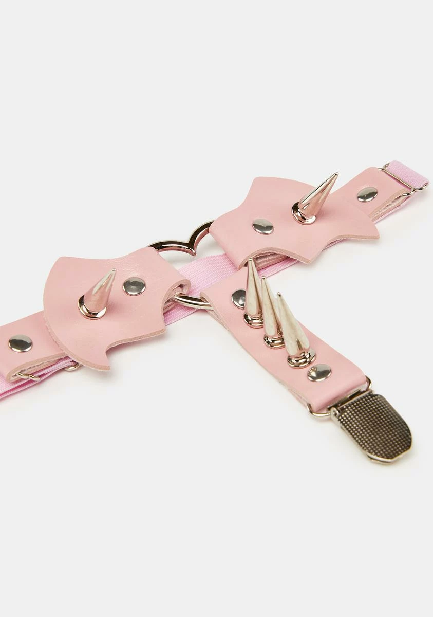 cuz it only comes out at night. This garter set has a vegan leather construction, heart shaped metal hardware, a bat wing shaped design, long spiked detailing, and attached garter clips.