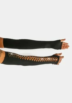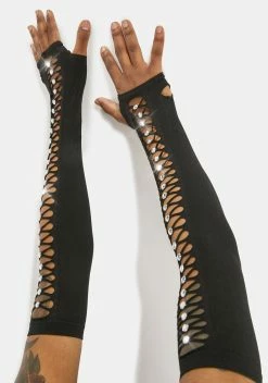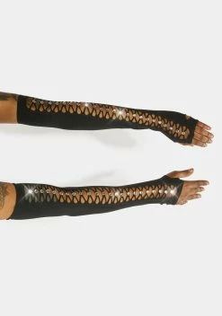give âem y2k vibes! These long fingerless gloves have a strappy cut-out design with rhinestone details.